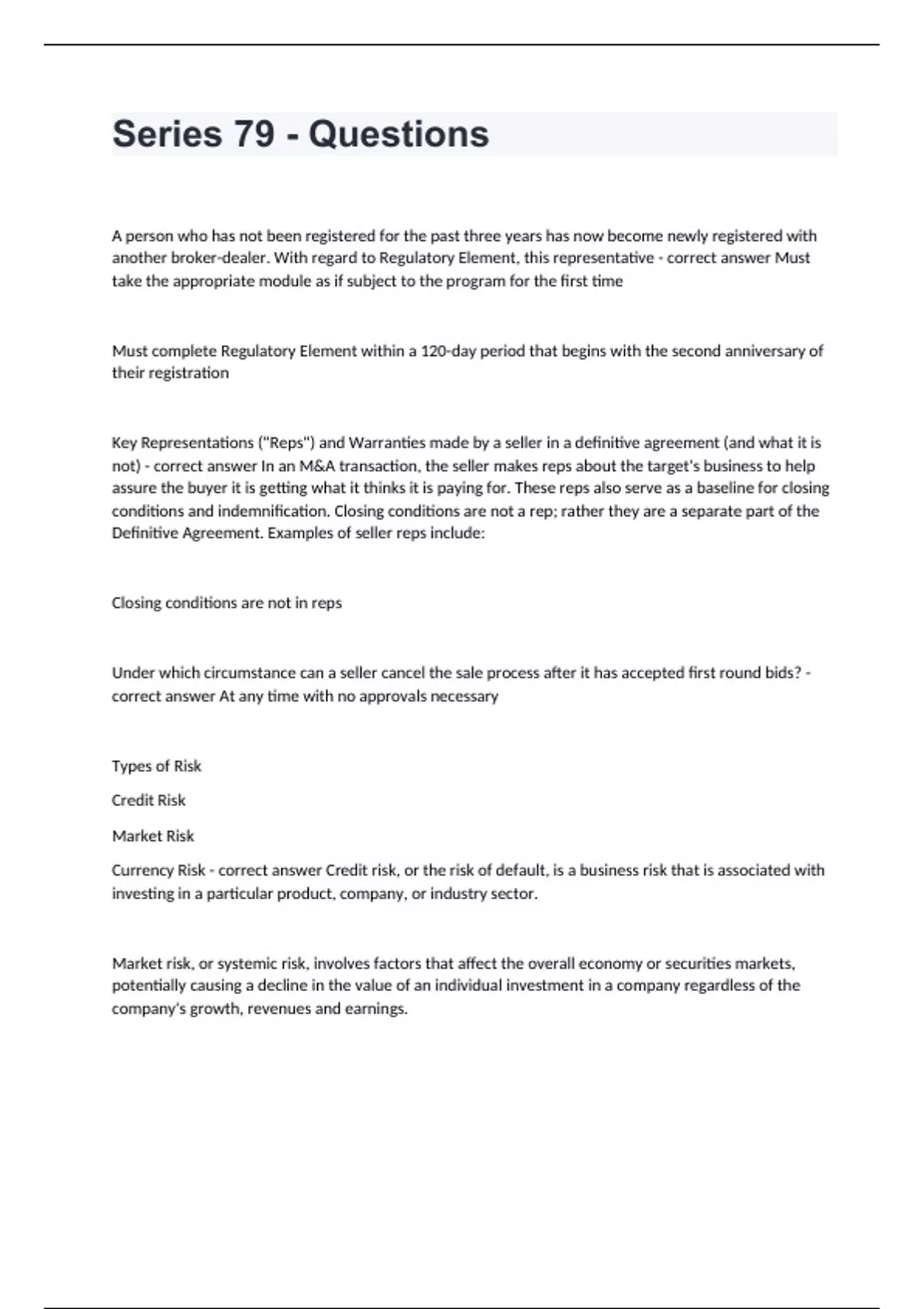 Series 79 - Questions A person who has not been registered for the past three years has now become newly registered with another broker-dealer. With regard to Regulatory Element, this representative - correct answer Must take the appropriate module as if subject to the program for the first time Must complete Regulatory Element within a 120-day period that begins with the second anniversary of their registration Key Representations ("Reps") and Warranties made by a seller in a definitive agreement (and what it is not) - correct answer In an M&A transaction, the seller makes reps about the target's business to help assure the buyer it is getting what it thinks it is paying for. These reps also serve as a baseline for closing conditions and indemnification. Closing conditions are not a rep; rather they are a separate part of the Definitive Agreement. Examples of seller reps include: Closing conditions are not in reps Under which circumstance can a seller cancel the sale process after it has accepted first round bids? - correct answer At any time with no approvals necessary Types of Risk Credit Risk Market Risk Currency Risk - correct answer Credit risk, or the risk of default, is a business risk that is associated with investing in a particular product, company, or industry sector. Market risk, or systemic risk, involves factors that affect the overall economy or securities markets, potentially causing a decline in the value of an individual investment in a company regardless of the company's growth, revenues and earnings.