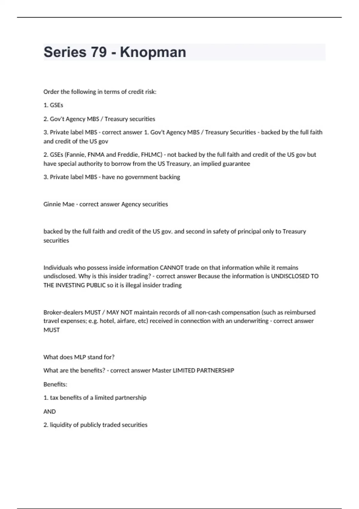 Series 79 - Order the following in terms of credit risk: 1. GSEs 2. Gov't Agency MBS / Treasury securities 3. Private label MBS - correct answer 1. Gov't Agency MBS / Treasury Securities - backed by the full faith and credit of the US gov 2. GSEs (Fannie, FNMA and Freddie, FHLMC) - not backed by the full faith and credit of the US gov but have special authority to borrow from the US Treasury, an implied guarantee 3. Private label MBS - have no government backing Ginnie Mae - correct answer Agency securities backed by the full faith and credit of the US gov. and second in safety of principal only to Treasury securities Individuals who possess inside information CANNOT trade on that information while it remains undisclosed. Why is this insider trading? - correct answer Because the information is UNDISCLOSED TO THE INVESTING PUBLIC so it is illegal insider trading Broker-dealers MUST / MAY NOT maintain records of all non-cash compensation (such as reimbursed travel expenses; e.g. hotel, airfare, etc) received in connection with an underwriting - correct answer MUST What does MLP stand for? What are the benefits? - correct answer Master LIMITED PARTNERSHIP Benefits: 1. tax benefits of a limited partnership AND 2. liquidity of publicly traded securities