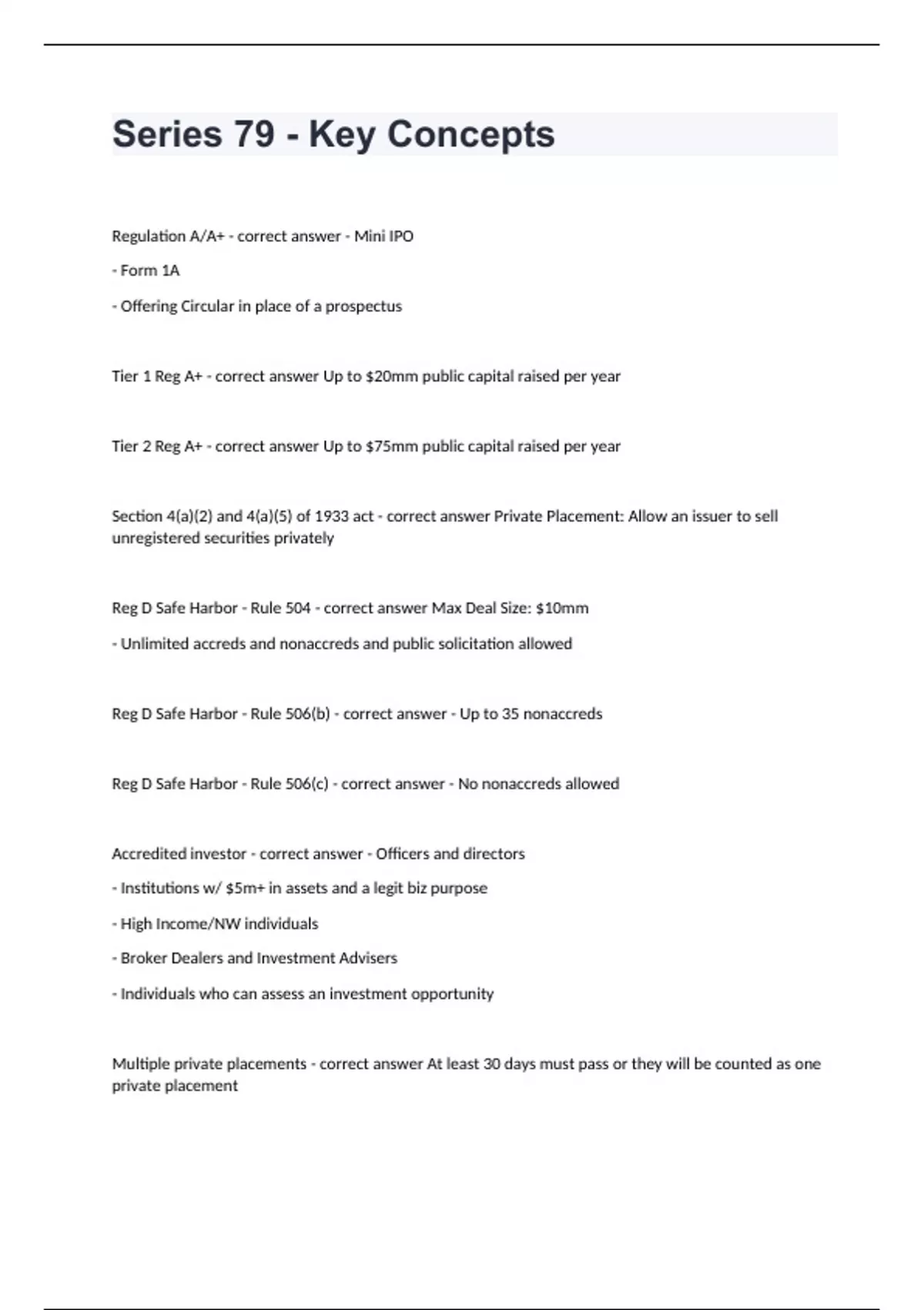 Series 79 - Key Concepts Regulation A/A+ - correct answer - Mini IPO - Form 1A - Offering Circular in place of a prospectus Tier 1 Reg A+ - correct answer Up to $20mm public capital raised per year Tier 2 Reg A+ - correct answer Up to $75mm public capital raised per year Section 4(a)(2) and 4(a)(5) of 1933 act - correct answer Private Placement: Allow an issuer to sell unregistered securities privately Reg D Safe Harbor - Rule 504 - correct answer Max Deal Size: $10mm - Unlimited accreds and nonaccreds and public solicitation allowed Reg D Safe Harbor - Rule 506(b) - correct answer - Up to 35 nonaccreds Reg D Safe Harbor - Rule 506(c) - correct answer - No nonaccreds allowed Accredited investor - correct answer - Officers and directors - Institutions w/ $5m+ in assets and a legit biz purpose - High Income/NW individuals - Broker Dealers and Investment Advisers - Individuals who can assess an investment opportunity Multiple private placements - correct answer At least 30 days must pass or they will be counted as one private placement