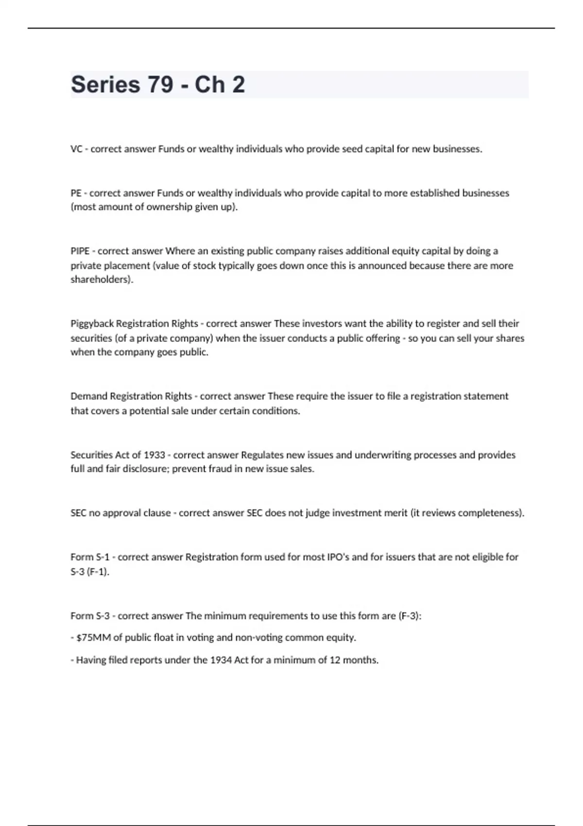 Series 79 - Ch 2 VC - correct answer Funds or wealthy individuals who provide seed capital for new businesses. PE - correct answer Funds or wealthy individuals who provide capital to more established businesses (most amount of ownership given up). PIPE - correct answer Where an existing public company raises additional equity capital by doing a private placement (value of stock typically goes down once this is announced because there are more shareholders). Piggyback Registration Rights - correct answer These investors want the ability to register and sell their securities (of a private company) when the issuer conducts a public offering - so you can sell your shares when the company goes public. Demand Registration Rights - correct answer These require the issuer to file a registration statement that covers a potential sale under certain conditions. Securities Act of 1933 - correct answer Regulates new issues and underwriting processes and provides full and fair disclosure; prevent fraud in new issue sales. SEC no approval clause - correct answer SEC does not judge investment merit (it reviews completeness). Form S-1 - correct answer Registration form used for most IPO's and for issuers that are not eligible for S-3 (F-1). Form S-3 - correct answer The minimum requirements to use this form are (F-3): - $75MM of public float in voting and non-voting common equity. - Having filed reports under the 1934 Act for a minimum of 12 months.