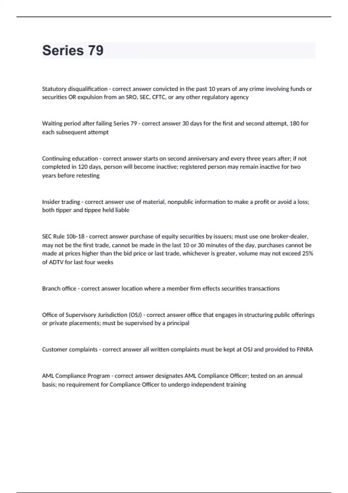Series 79Statutory disqualification - correct answer convicted in the past 10 years of any crime involving funds or securities OR expulsion from an SRO, SEC, CFTC, or any other regulatory agency Waiting period after failing Series 79 - correct answer 30 days for the first and second attempt, 180 for each subsequent attempt Continuing education - correct answer starts on second anniversary and every three years after; if not completed in 120 days, person will become inactive; registered person may remain inactive for two years before retesting Insider trading - correct answer use of material, nonpublic information to make a profit or avoid a loss; both tipper and tippee held liable SEC Rule 10b-18 - correct answer purchase of equity securities by issuers; must use one broker-dealer, may not be the first trade, cannot be made in the last 10 or 30 minutes of the day, purchases cannot be made at prices higher than the bid price or last trade, whichever is greater, volume may not exceed 25% of ADTV for last four weeks Branch office - correct answer location where a member firm effects securities transactions Office of Supervisory Jurisdiction (OSJ) - correct answer office that engages in structuring public offerings or private placements; must be supervised by a principal Customer complaints - correct answer all written complaints must be kept at OSJ and provided to FINRA AML Compliance Program - correct answer designates AML Compliance Officer; tested on an annual basis; no requirement for Compliance Officer to undergo independent training