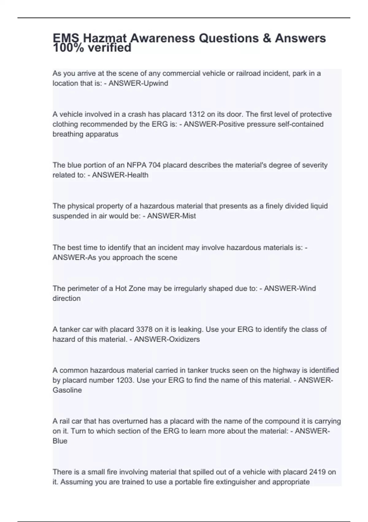 As you arrive at the scene of any commercial vehicle or railroad incident, park in a location that is: - ANSWER-Upwind A vehicle involved in a crash has placard 1312 on its door. The first level of protective clothing recommended by the ERG is: - ANSWER-Positive pressure self-contained breathing apparatus The blue portion of an NFPA 704 placard describes the material's degree of severity related to: - ANSWER-Health The physical property of a hazardous material that presents as a finely divided liquid suspended in air would be: - ANSWER-Mist The best time to identify that an incident may involve hazardous materials is: - ANSWER-As you approach the scene The perimeter of a Hot Zone may be irregularly shaped due to: - ANSWER-Wind direction A tanker car with placard 3378 on it is leaking. Use your ERG to identify the class of hazard of this material. - ANSWER-Oxidizers A common hazardous material carried in tanker trucks seen on the highway is identified by placard number 1203. Use your ERG to find the name of this material. - ANSWER-Gasoline A rail car that has overturned has a placard with the name of the compound it is carrying on it. Turn to which section of the ERG to learn more about the material: - ANSWER-Blue