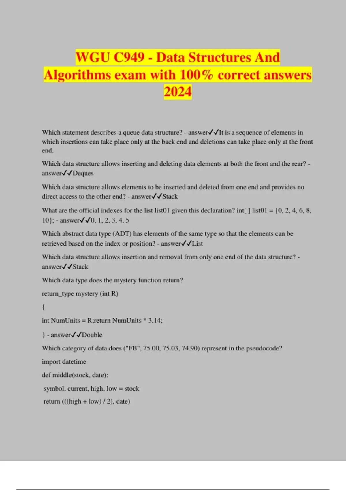 WGU C949 - Data Structures And Algorithms exam with 100% correct answers 2024 Which statement describes a queue data structure? - answerIt is a sequence of elements in which insertions can take place only at the back end and deletions can take place only at the front end. Which data structure allows inserting and deleting data elements at both the front and the rear? - answerDeques Which data structure allows elements to be inserted and deleted from one end and provides no direct access to the other end? - answerStack What are the official indexes for the list list01 given this declaration? int[ ] list01 = {0, 2, 4, 6, 8, 10}; - answer0, 1, 2, 3, 4, 5 Which abstract data type (ADT) has elements of the same type so that the elements can be retrieved based on the index or position? - answerList Which data structure allows insertion and removal from only one end of the data structure? - answerStack Which data type does the mystery function return? return_type mystery (int R) { int NumUnits = R;return NumUnits * 3.14; } - answerDouble Which category of data does ("FB", 75.00, 75.03, 74.90) represent in the pseudocode? import datetime def middle(stock, date): symbol, current, high, low = stock return (((high + low) / 2), date) mid_value, date = middle(("FB", 75.00, 75.03, 74.90), (2014, 10, 31)) - answerTuple Which value is appropriate for Test1 given the expression? char Test1; - answer'L' Which value is appropriate for the variable middle given the pseudocode? function mystery() { string last; string first; char middle; int phone; float rate; } - answer'D' Which type of operation is represented in the pseudocode? int x,y,z; x=y=z=100; - answerAssignment What is the most efficient data type to use for this data set of a fixed size in Java? a = [0, 0, 1, 4, 7, 16, 31, 64, 127] - answerArray Which data type is appropriate for this array to store the given data? a = ["AF", "71", "BC", "157", "BA", "253"] - answerString Which data type is appropriate for the given d