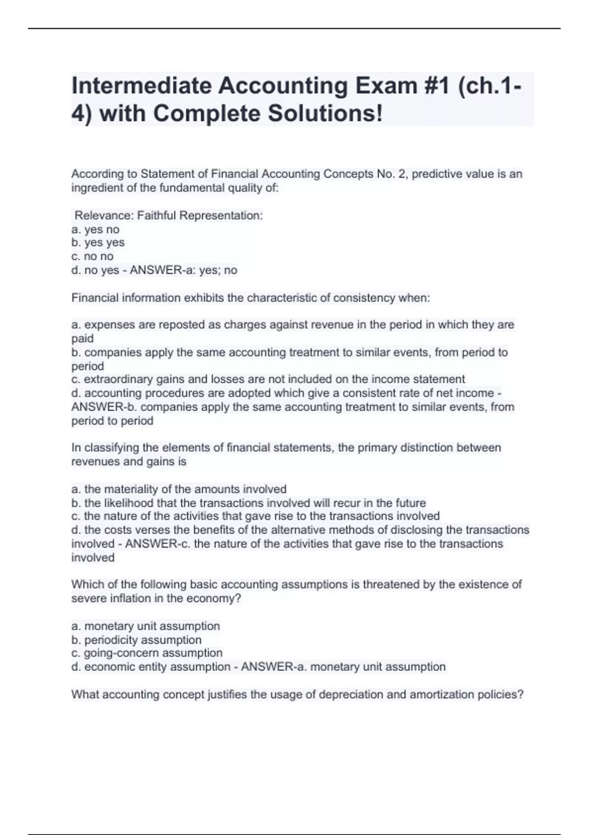 According to Statement of Financial Accounting Concepts No. 2, predictive value is an ingredient of the fundamental quality of: Relevance: Faithful Representation: a. yes no b. yes yes c. no no d. no yes - ANSWER-a: yes; no Financial information exhibits the characteristic of consistency when: a. expenses are reposted as charges against revenue in the period in which they are paid b. companies apply the same accounting treatment to similar events, from period to period c. extraordinary gains and losses are not included on the income statement d. accounting procedures are adopted which give a consistent rate of net income - ANSWER-b. companies apply the same accounting treatment to similar events, from period to period In classifying the elements of financial statements, the primary distinction between revenues and gains is a. the materiality of the amounts involved b. the likelihood that the transactions involved will recur in the future c. the nature of the activities that gave rise to the transactions involved d. the costs verses the benefits of the alternative methods of disclosing the transactions involved - ANSWER-c. the nature of the activities that gave rise to the transactions involved Which of the following basic accounting assumptions is threatened by the existence of severe inflation in the economy? a. monetary unit assumption b. periodicity assumption c. going-concern assumption d. economic entity assumption - ANSWER-a. monetary unit assumption What accounting concept justifies the usage of depreciation and amortization policies? a. going-concern assumption b. fair value principle c. full disclosure principle d. monetary unit assumption - ANSWER-a. going-concern assumption The allowance for doubtful accounts, which appears as a deduction from accounts receivable on a balance sheet and which is based on an estimate of bad debts, is an app