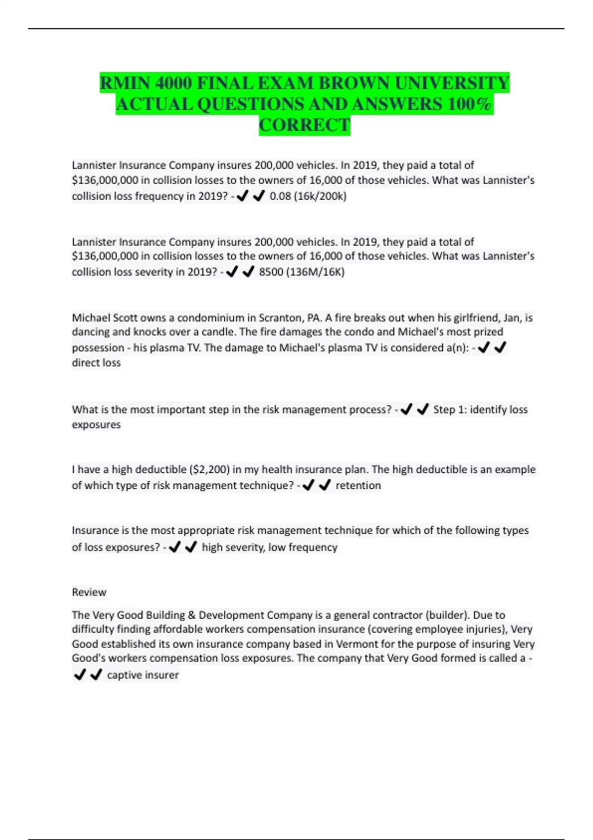 RMIN 4000 FINAL EXAM BROWN UNIVERSITY ACTUAL QUESTIONS AND ANSWERS 100% CORRECT Lannister Insurance Company insures 200,000 vehicles. In 2019, they paid a total of $136,000,000 in collision losses to the owners of 16,000 of those vehicles. What was Lannister's collision loss frequency in 2019? -️️ 0.08 (16k/200k) Lannister Insurance Company insures 200,000 vehicles. In 2019, they paid a total of $136,000,000 in collision losses to the owners of 16,000 of those vehicles. What was Lannister's collision loss severity in 2019? -️️ 8500 (136M/16K) Michael Scott owns a condominium in Scranton, PA. A fire breaks out when his girlfriend, Jan, is dancing and knocks over a candle. The fire damages the condo and Michael's most prized possession - his plasma TV. The damage to Michael's plasma TV is considered a(n): -️️ direct loss What is the most important step in the risk management process? -️️ Step 1: identify loss exposures I have a high deductible ($2,200) in my health insurance plan. The high deductible is an example of which type of risk management technique? -️️ retention Insurance is the most appropriate risk management technique for which of the following types of loss exposures? -️️ high severity, low frequency Review The Very Good Building & Development Company is a general contractor (builder). Due to difficulty finding affordable workers compensation insurance (covering employee injuries), Very Good established its own insurance company based in Vermont for the purpose of insuring Very Good's workers compensation loss exposures. The company that Very Good formed is called a -️️ captive insurer Jim Halpert and his wife, Pam, are selling the home they've lived in for the past seven years. They are aware of an electrical problem in the home that they do not want to fix because it would be expensive. Potential buyers of the home are unaware of the electrical problem. This is an example of: -️️ Asymmetric Information