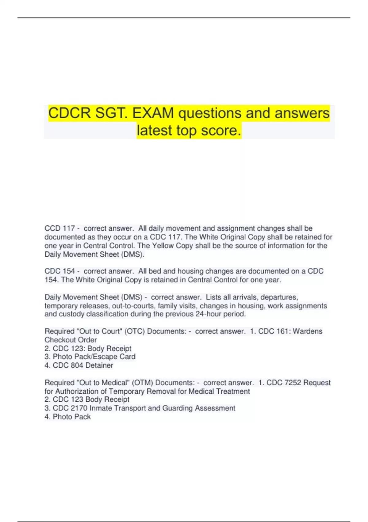 CDCR SGT. EXAM questions and answers latest top score. CCD 117 - correct answer. All daily movement and assignment changes shall be documented as they occur on a CDC 117. The White Original Copy shall be retained for one year in Central Control. The Yellow Copy shall be the source of information for the Daily Movement Sheet (DMS). CDC 154 - correct answer. All bed and housing changes are documented on a CDC 154. The White Original Copy is retained in Central Control for one year. Daily Movement Sheet (DMS) - correct answer. Lists all arrivals, departures, temporary releases, out-to-courts, family visits, changes in housing, work assignments and custody classification during the previous 24-hour period. Required "Out to Court" (OTC) Documents: - correct answer. 1. CDC 161: Wardens Checkout Order 2. CDC 123: Body Receipt 3. Photo Pack/Escape Card 4. CDC 804 Detainer Required "Out to Medical" (OTM) Documents: - correct answer. 1. CDC 7252 Request for Authorization of Temporary Removal for Medical Treatment 2. CDC 123 Body Receipt 3. CDC 2170 Inmate Transport and Guarding Assessment 4. Photo Pack Stage 1 Level of Disturbance/Emergency - correct answer. Incidents for which it is determined that containment and control can be achieved by on-duty personnel. Stage 2 Level of Disturbance/Emergency - correct answer. Incident requires on- and off-duty staff to control Stage 3 Level of Disturbance/Emergency - correct answer. Incident requires assistance from intra-departmental (i.e. other institutions, Paroles, etc.), and/or outside agencies (i.e. CHP, Sheriff's Dept., etc.) Stage 4 Level of Disturbance/Emergency - correct answer. Incident requires assistance from the Office of Emergency Services (OES), National Guard, etc. Level 1 (I) Inmate Classification - correct answer. 0-18 Points: Open Dorm without armed perimeter. Level 2 (II) Inmate Classification - correct answer. 19-35 Points: Open dorm with secure perimeter. Level 3 (III) Inmate Classification - correct answer. 36-59 Points: Cell construction with fenced perimeter and armed coverage. Level 4 (IV) Inmate Classification - correct answer. 60+ Points: 1. Secure perimeter 2. Inside/Outside armed coverage 3. Inside Cell Construction/Outside Cell Construction CCR 3084 - correct answer. 602 I/M Appeal CCR 3084 (602 I/M Appeal) Exceptions To Time Limits - correct answer. 1. Unavailability of the I/M, staff or witnesses. 2. Complexity of the decision, action, or policy requiring additional research. 3. Necessary involvement of other agencies or jurisdictions. 4. State of Emergency pursuant to CCR 3383(c) requiring the postponement of nonessential administrative decisions and actions including normal time requirements for such decisions and actions. CCR 3084 I/M Appeal 1st Level: - correct answer. 30 Working Days Usually Heard by Facility Supervisor CCR 3084 I/M Appeal 2nd Level: - correct answer. 30 Working Days Usually Heard by Warden or Designee CCR 3084 I/M Appeal 3rd Level: - correct answer. 60 Working Days. Usually Heard at the Director's Level. Emergency Appeals: - correct answer. If warranted, the 1st level shall be waived. The 2nd Level shall be completed in 5 Working days. Who Can Be the Chief Disciplinary Officer (CDO)? - correct answer. A person not below the level of a Correctional Administrator or Parole Administrator I. What is the Role of the Chief Disciplinary Officer (CDO)? - correct answer. 1. Affirm, Reverse or Modify the disciplinary action or credit forfeiture. 2. Order a different action/method 3. Dismiss 4. Order a re-hearing What are the 3 ways of I/M Discipline? - correct answer. 1. Verbal Counseling 2. Custodial Chrono (CDC 128-A) 3. Rules Violation Report (RVR) CDC 115 Who reviews all disciplinary methods and actions? - correct answer. Chief Disciplinary Officer (CDO) Who can classify a 115? - correct answer. 1. Captain, PA3, CC3 OR 2. An experienced LT, CC2 or PA2 * EXCEPTION: Facilities having 1 Lieutenant or higher... a Sergeant can classify a 115. What are the two classifications of a 115? - correct answer. 1. Serious (CCR 3315) 2. Administrative (CCR 3314) Can a person who classifies a 115, hear that same 115? - correct answer. No. What does a CCR 3314 cover? - correct answer. '"Administrative" Rules Violation Report (RVR) Does an I/M have a right to call a witness(es) for an Administrative Hearing? - correct answer. No. What are the required documents for Administrative Segregation (Ad. Seg.)? - correct answer. 1. 114D ASU Placement Notice 2. 114A - I/M Daily Activities Log Sheet while in ASU 3. 114-A1: Segregation Profile (must be updated every 90-days) including non-confidential enemies on CDC 812. 4. 7219 Medical Evaluation 5. 128-MH7: Pre Ad. Seg. Placement Mental Health Screening.