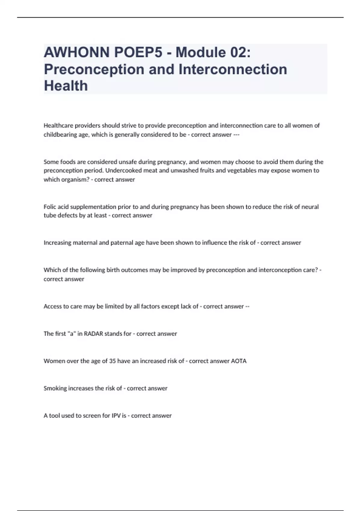 AWHONN POEP5 - Module 02 Preconception and Interconception Health questions and answers certified 2024