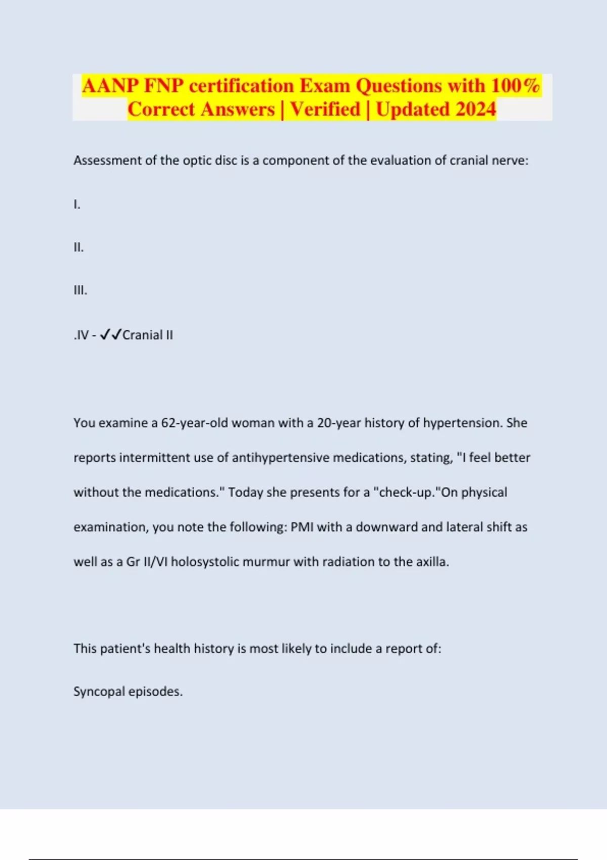Assessment of the optic disc is a component of the evaluation of cranial nerve: I. II. III. .IV - Cranial II You examine a 62-year-old woman with a 20-year history of hypertension. She reports intermittent use of antihypertensive medications, stating, "I feel better without the medications." Today she presents for a "check-up."On physical examination, you note the following: PMI with a downward and lateral shift as well as a Gr II/VI holosystolic murmur with radiation to the axilla