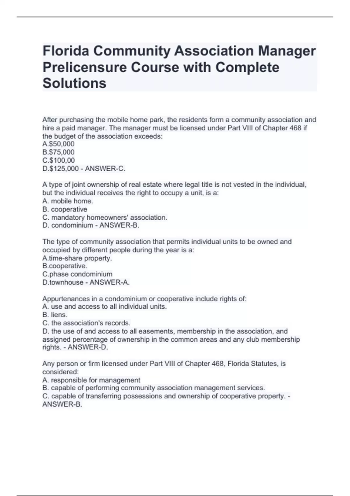 Florida Community Association Manager Prelicensure Course with Complete SolutionsFlorida Community Association Manager Prelicensure Course with Complete SolutionsFlorida Community Association Manager Prelicensure Course with Complete Solutions After purchasing the mobile home park, the residents form a community association and hire a paid manager. The manager must be licensed under Part VIII of Chapter 468 if the budget of the association exceeds: A.$50,000 B.$75,000 C.$100,00 D.$125,000 - ANSWER-C. A type of joint ownership of real estate where legal title is not vested in the individual, but the individual receives the right to occupy a unit, is a: A. mobile home. B. cooperative C. mandatory homeowners' association. D. condominium - ANSWER-B. The type of community association that permits individual units to be owned and occupied by different people during the year is a: A.time-share property. B.cooperative.