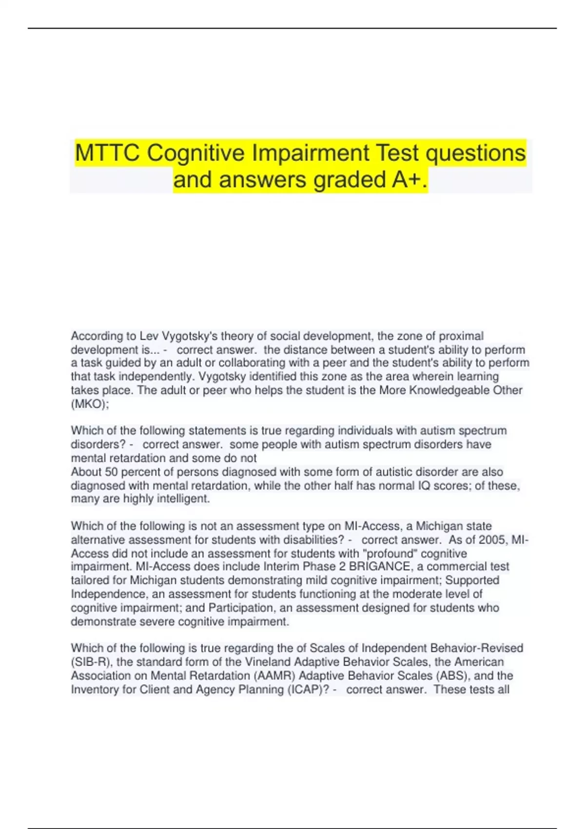 MTTC Cognitive Impairment Test questions and answers graded A+. According to Lev Vygotsky's theory of social development, the zone of proximal development is... - correct answer. the distance between a student's ability to perform a task guided by an adult or collaborating with a peer and the student's ability to perform that task independently. Vygotsky identified this zone as the area wherein learning takes place. The adult or peer who helps the student is the More Knowledgeable Other (MKO); Which of the following statements is true regarding individuals with autism spectrum disorders? - correct answer. some people with autism spectrum disorders have mental retardation and some do not About 50 percent of persons diagnosed with some form of autistic disorder are also diagnosed with mental retardation, while the other half has normal IQ scores; of these, many are highly intelligent. Which of the following is not an assessment type on MI-Access, a Michigan state alternative assessment for students with disabilities? - correct answer. As of 2005, MI-Access did not include an assessment for students with "profound" cognitive impairment. MI-Access does include Interim Phase 2 BRIGANCE, a commercial test tailored for Michigan students demonstrating mild cognitive impairment; Supported Independence, an assessment for students functioning at the moderate level of cognitive impairment; and Participation, an assessment designed for students who demonstrate severe cognitive impairment. Which of the following is true regarding the of Scales of Independent Behavior-Revised (SIB-R), the standard form of the Vineland Adaptive Behavior Scales, the American Association on Mental Retardation (AAMR) Adaptive Behavior Scales (ABS), and the Inventory for Client and Agency Planning (ICAP)? - correct answer. These tests all supply intercorrelations among their own different subscales to show relationships among their individual test components. It is not true that they all give comparison scores between students with and without disabilities. Only the SIB-R and the ICAP provide this information for age-matched populations. None of the four tests give discriminant analyses to aid with school placements and determining level of mental retardation (MR); again, only the SIB-R and the ICAP supply these. Therefore, it is not true that these tests all incorporate all of these components. According to the IDEA 2004 law, when do students become involved in their own transition planning as a part of their IEP (Individual Education Plan)? - correct answer. According to IDEA (Individuals with Disabilities Education Act) 2004, students become involved in their own transition planning, which is included in their IEPs, when they reach the age of 16. At this age, students are also expected to sign their IEPs. The 1994 IDEA mandated beginning transition planning when the student reached the age of 14, but this was changed in the newer version of the law. Educators, parents, and students are still encouraged to begin transition planning when the student is 14, as it can take several years with some students, but it is not legally required until the student is 16. # 1 Example of a 36 month old child showing language delay - correct answer. B. 36 month old child has an oral expression vocab of 20 words and does not combine words in her speech # 2 A third grade autistic student will most likely show difficulty with the following task - correct answer. A. working cooperatively with other students on class projects # 3 a leading prenatal cause of cognitive impairments is - correct answer. C. exposure to substance abuse # 4 teaching mild to moderate c.i. students to cross the street with these steps (stop, look, listen, walk) is successful if - correct answer. D. students practice as often as possible in the actual setting where they will use these steps # 5 in a standardized adaptive behavior assessment of a student with c.i., normative data should be used to provide which type of information - correct answer. A. a comparison of student's conceptual, social and practical abilities with those of students without cognitive impairments # 6 when interviewing parents of a student demonstrating difficulties in all academic areas and demonstrates inappropriate social behaviors which of the following questions would provide the most useful information to the teacher? A. when did you first notice student using language to communicate his needs B. what kind of toys does he play with C. does he follow a routine at home D. is he involved in community activities - correct answer. A. when did you first notice the student using language to communicate his needs # 7 a good assessment to provide AT to a student with cerebral palsy for eating assistance is - correct answer. B. an informal assessment at lunch to introduce student to various AT devices and observe which is easiest and most effective for student to use # 8 communicating test results to parents who have just moved to the U.S. and primary language not english - correct answer. A. present all information to parents in their native language using a professional education interpreter and translator # 9 an IEP team is meeting to see if placement changes are needed for a student with moderate c.i. who has just been placed on seizure meds that affect his memory and motor movement. he is currently in gen ed with pull out special ed services for functional living instruction. which are important steps for the IEP team to take when deciding placement - correct answer. D. determine the LRE within the school's continuum services that will meet the students learning needs # 10 which strategies will be most effective in preparing high school students with c.i. to live productively in a culturally diverse community environment - correct answer. A. ensure that students have regular opp to work with students, employers, and coworkers from a variety of cultural backgrounds in school and on-site vocationa