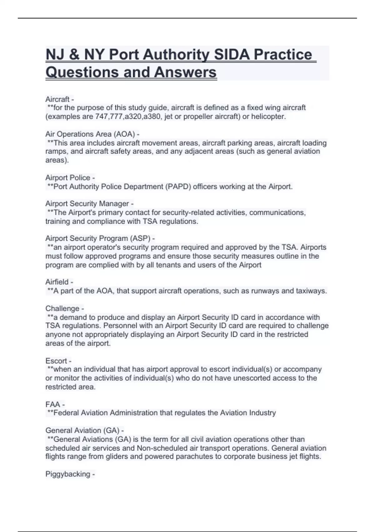 NJ & NY Port Authority SIDA Practice Questions and Answers.