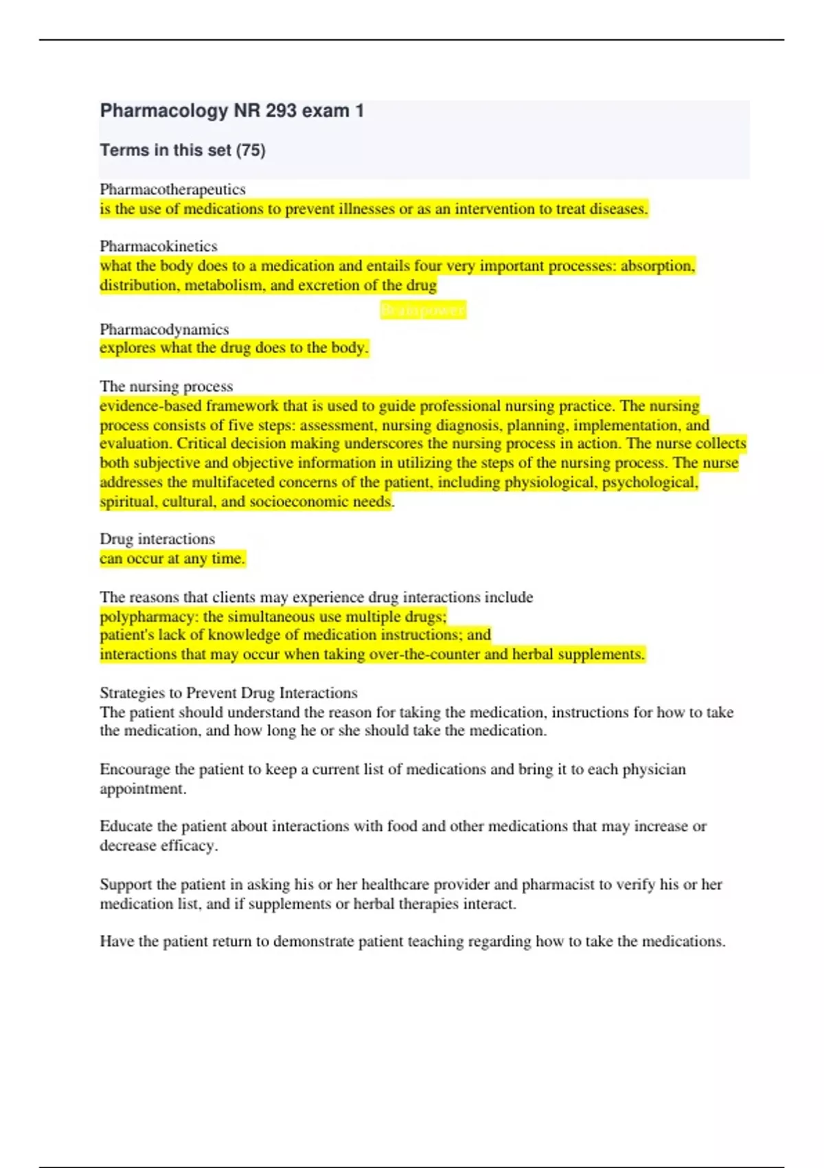 Terms in this set (75) Pharmacotherapeutics is the use of medications to prevent illnesses or as an intervention to treat diseases. Pharmacokinetics what the body does to a medication and entails four very important processes: absorption, distribution, metabolism, and excretion of the drug Brainpower Pharmacodynamics explores what the drug does to the body. The nursing process evidence-based framework that is used to guide professional nursing practice. The nursing process consists of five steps: assessment, nursing diagnosis, planning, implementation, and evaluation. Critical decision making underscores the nursing process in action. The nurse collects both subjective and objective information in utilizing the steps of the nursing process. The nurse addresses the multifaceted concerns of the patient, including physiological, psychological, spiritual, cultural, and socioeconomic needs. Drug interactions can occur at any time. The reasons that clients may experience drug interactions include polypharmacy: the simultaneous use multiple drugs; patient's lack of knowledge of medication instructions; and interactions that may occur when taking over-the-counter and herbal supplements. Strategies to Prevent Drug Interactions The patient should understand the reason for taking the medication, instructions for how to take the medication, and how long he or she should take the medication. Encourage the patient to keep a current list of medications and bring it to each physician appointment. Educate the patient about interactions with food and other medications that may increase or decrease efficacy. Support the patient in asking his or her healthcare provider and pharmacist to verify his or her medication list, and if supplements or herbal therapies interact. Have the patient return to demonstrate patient teaching regarding how to take the medications.