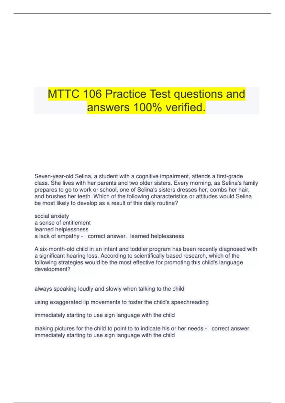 MTTC 106 Practice Test questions and answers 100% verified. Seven-year-old Selina, a student with a cognitive impairment, attends a first-grade class. She lives with her parents and two older sisters. Every morning, as Selina's family prepares to go to work or school, one of Selina's sisters dresses her, combs her hair, and brushes her teeth. Which of the following characteristics or attitudes would Selina be most likely to develop as a result of this daily routine? social anxiety a sense of entitlement learned helplessness a lack of empathy - correct answer. learned helplessness A six-month-old child in an infant and toddler program has been recently diagnosed with a significant hearing loss. According to scientifically based research, which of the following strategies would be the most effective for promoting this child's language development? always speaking loudly and slowly when talking to the child using exaggerated lip movements to foster the child's speechreading immediately starting to use sign language with the child making pictures for the child to point to to indicate his or her needs - correct answer. immediately starting to use sign language with the child Five-year-old John has been enrolled in a kindergarten class partway through the school year. On his first day at school, John chooses to play in the block center. John first spends a few minutes watching what two of his new classmates are building, then sits down near them and starts making a road. After a few more minutes, John says to the children, "Hey, we could connect my road to your road. Look." One of the other children says, "Yeah, then we could make a really, really long road around the city!" Soon all three children are working busily on the road. John's behavior in this situation best demonstrates how: proficiency in social skills can facilitate communication and collaborative thinking. the ability to self-regulate can facilitate interpersonal problem solving and conflict resolution. a positive disposition toward learning can facilitate growth across multiple developmental domains. perseverance in com - correct answer. proficiency in social skills can facilitate communication and collaborative thinking. Which of the following children is demonstrating behavior that is atypical of a three-year-old child? Katya draws figures that resemble circles. Tranh covers a page with scribbles and announces that it's a grocery list. Gwen has difficulty holding and cutting with scissors. Jonah draws detailed pictures of his mother with specific facial features. - correct answer. Jonah draws detailed pictures of his mother with specific facial features. Ava is a four-year-old child who has Down syndrome. In which of the following areas would Ava be likely to have the most significant developmental delay? social learning spatial processing visual memory speech production - correct answer. speech production Ms. Cohen, a preschool teacher, is preparing for the upcoming school year. This year's class will include Warren, a child who has Down syndrome. As she plans for the first weeks of school, Ms. Cohen should be aware that Warren is especially likely to benefit from learning activities that: involve whole-class instruction. emphasize auditory processing. begin with a conceptual overview. incorporate visual cues. - correct answer. incorporate visual cues. Five-year-old Silvio, a student with spina bifida, will be attending a general education preschool class in the upcoming year. Silvio uses a power wheelchair, which he propels independently. Which of the following issues would be especially important for Silvio's preschool teacher to be aware of in order to promote Silvio's health and physical well-being in the classroom? checking Silvio's wheelchair thoroughly for proper function on Monday of each week ensuring that Silvio's pressure relief regimen is followed everyday without fail isolating Silvio whenever one or more of his classmates shows any signs of illness confirming each day that Silvio has been administered his required daily medications - correct answer. ensuring that Silvio's pressure relief regimen is followed everyday without fail A prekindergarten teacher who works in an inclusive setting wishes to create a learning environment that promotes children's independence in the classroom. Which of the following strategies would likely be most effective for the teacher to use to achieve this goal? having children participate in putting away their toys and materials providing opportunities for children to make choices about activities and tasks each school day incorporating instructional themes that build on children's interests encouraging children to work alone on activities and tasks rather than with a classmate - correct answer. providing opportunities for children to make choices about activities and tasks each school day Six-year-old Noah is a student with autism spectrum disorder who attends Ms. Wu's first-grade class. Ms. Wu has created a visual schedule with Noah to help him learn the daily classroom routine; however, Noah has difficulty when anything out of the ordinary happens. For example, during a recent unannounced fire drill, he began shouting and pulling his hair. Ms. Wu is aware that the class will be attending an assembly later in the week during a time regularly scheduled for mathematics instruction. Which of the following strategies would likely be most effective for Ms. Wu to use to help Noah with this change in the schedule? assigning Noah to sit with a peer who can model good behavior for him during the assembly talking to Noah about the assembly well ahead of time and adding pictures to his visual schedule to illustrate the change arranging for a paraprofessional to stay with Noah in the classroom during the ass - correct answer. talking to Noah about the assembly well ahead of time and adding pictures to his visual The outdoor play area at an early childhood center has a play structure that consi