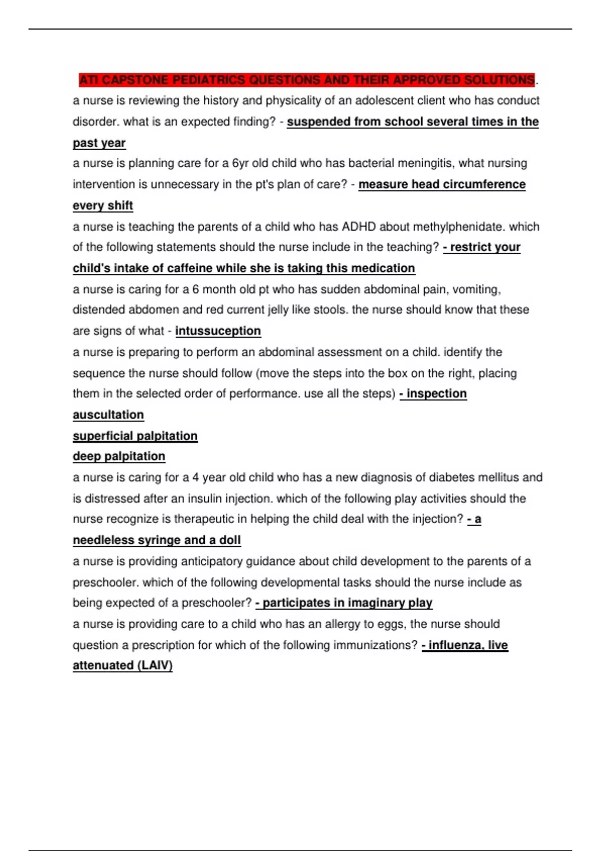 ATI CAPSTONE PEDIATRICS QUESTIONS AND THEIR APPROVED SOLUTIONS. a nurse is reviewing the history and physicality of an adolescent client who has conduct disorder. what is an expected finding? - suspended from school several times in the past year a nurse is planning care for a 6yr old child who has bacterial meningitis, what nursing intervention is unnecessary in the pt's plan of care? - measure head circumference every shift a nurse is teaching the parents of a child who has ADHD about methylphenidate. which of the following statements should the nurse include in the teaching? - restrict your child's intake of caffeine while she is taking this medication a nurse is caring for a 6 month old pt who has sudden abdominal pain, vomiting, distended abdomen and red current jelly like stools. the nurse should know that these are signs of what - intussuception a nurse is preparing to perform an abdominal assessment on a child. identify the sequence the nurse should follow (move the steps into the box on the right, placing them in the selected order of performance. use all the steps) - inspection auscultation superficial palpitation deep palpitation a nurse is caring for a 4 year old child who has a new diagnosis of diabetes mellitus and is distressed after an insulin injection. which of the following play activities should the nurse recognize is therapeutic in helping the child deal with the injection? - a needleless syringe and a doll a nurse is providing anticipatory guidance about child development to the parents of a preschooler. which of the following developmental tasks should the nurse include as being expected of a preschooler? - participates in imaginary play a nurse is providing care to a child who has an allergy to eggs, the nurse should question a prescription for which of the following immunizations? - influenza, live attenuated (LAIV) a nurse is caring for a 10 month old infant who is in a cast for developmental dysplasia of the hip (DDH). which of the following strategies should the nurse implement to promote the infant's growth and development - allow the infant to stand in the crib a nurse is caring for a 6month old infant following surgery. which of the following should the nurse use to measure pain in this client - FLACC pain scale a nurse is assisting with the admission of a child who has measles. which of the isolation precautions should the nurse initiate - airborne which of the following is the priority intervention a nurse should take when caring for a child who just experienced a febrile seizure - keep in a side-lying position a nurse is planning care for a 10yr old child who will be hospitalized for an extended period of time. what actions should the nurse include in the plan of care to meet the pt's psychosocial needs according to Erikson? - arrange for a teacher to provide lesson plans a nurse is caring for a pt who was admitted with suspected rheumatic fever. the provider prescribes an anti-streptolysin O titer (ASO), the parent asks the nurse the purpose of the test - it is to confirm if your child has had a recent streptococcal infection a nurse is caring for an infant following a cleft lip and palate repair. what actions should the nurse take in the post-op period - administer analgesics a nurse is providing dietary education to the mother of an infant, what recommendations regarding the introduction of solid food to the infant's diet should the nurse make - solids introduced between 4-6 months iron fortified cereal should be offered first new foods should be introduced one at a time over a 5-7 day period to observe for signs of allergies or intolerance veggies/fruits are first started between 6-8 months a nurse is caring for an infant who has a congenital heart defect, which defect is associated with increased pulmonary blood flow - patent ductus arteriosis a nurse is providing health promotion teaching to the parents of a toddler, what information should the nurse include in the teaching (SATA) - management of tantrums dental care