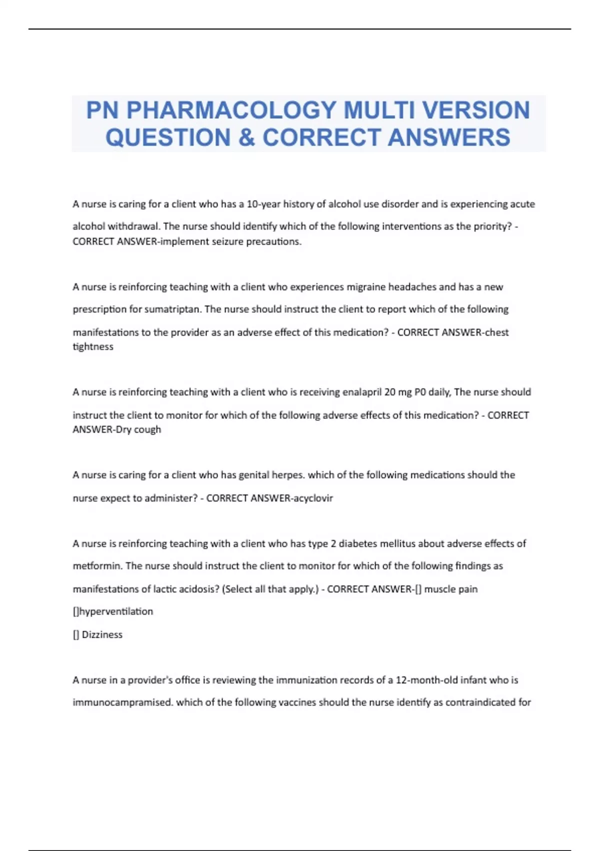 PN PHARMACOLOGY MULTI VERSION QUESTION & CORRECT ANSWERS A nurse is caring for a client who has a 10-year history of alcohol use disorder and is experiencing acute alcohol withdrawal. The nurse should identify which of the following interventions as the priority? - CORRECT ANSWER-implement seizure precautions. A nurse is reinforcing teaching with a client who experiences migraine headaches and has a new prescription for sumatriptan. The nurse should instruct the client to report which of the following manifestations to the provider as an adverse effect of this medication? - CORRECT ANSWER-chest tightness