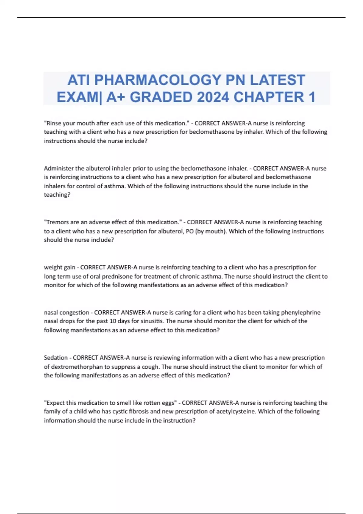 ATI PHARMACOLOGY PN LATEST EXAM| A+ GRADED 2024 CHAPTER 1 "Rinse your mouth after each use of this medication." - CORRECT ANSWER-A nurse is reinforcing teaching with a client who has a new prescription for beclomethasone by inhaler. Which of the following instructions should the nurse include? Administer the albuterol inhaler prior to using the beclomethasone inhaler. - CORRECT ANSWER-A nurse is reinforcing instructions to a client who has a new prescription for albuterol and beclomethasone inhalers for control of asthma. Which of the following instructions should the nurse include in the teaching? "Tremors are an adverse effect of this medication." - CORRECT ANSWER-A nurse is reinforcing teaching to a client who has a new prescription for albuterol, PO (by mouth). Which of the following instructions should the nurse include?