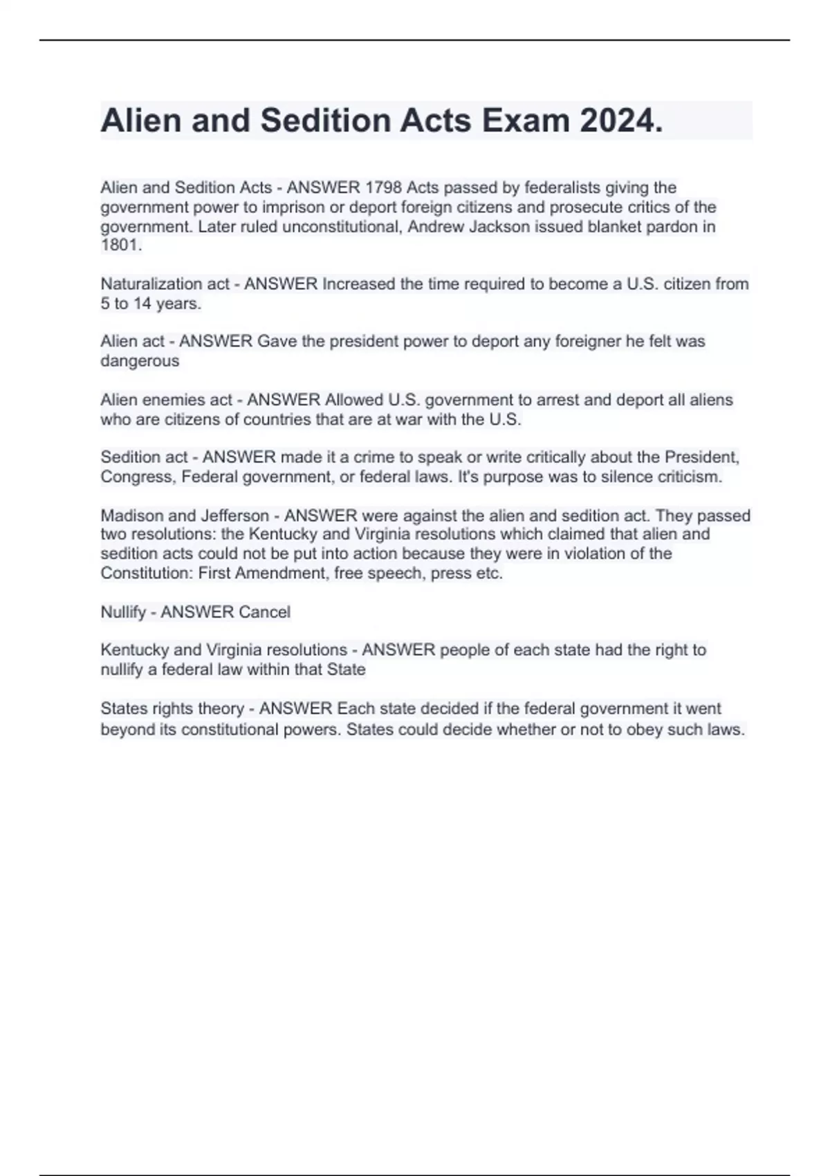 Alien and Sedition Acts Exam 2024. Alien and Sedition Acts - ANSWER 1798 Acts passed by federalists giving the government power to imprison or deport foreign citizens and prosecute critics of the government. Later ruled unconstitutional, Andrew Jackson issued blanket pardon in 1801. Naturalization act - ANSWER Increased the time required to become a U.S. citizen from 5 to 14 years. Alien act - ANSWER Gave the president power to deport any foreigner he felt was dangerous Alien enemies act - ANSWER Allowed U.S. government to arrest and deport all aliens who are citizens of countries that are at war with the U.S. Sedition act - ANSWER made it a crime to speak or write critically about the President, Congress, Federal government, or federal laws. It's purpose was to silence criticism. Madison and Jefferson - ANSWER were against the alien and sedition act. They passed two resolutions: the Kentucky and Virginia resolutions which claimed that alien and sedition acts could not be put into action because they were in violation of the Constitution: First Amendment, free speech, press etc