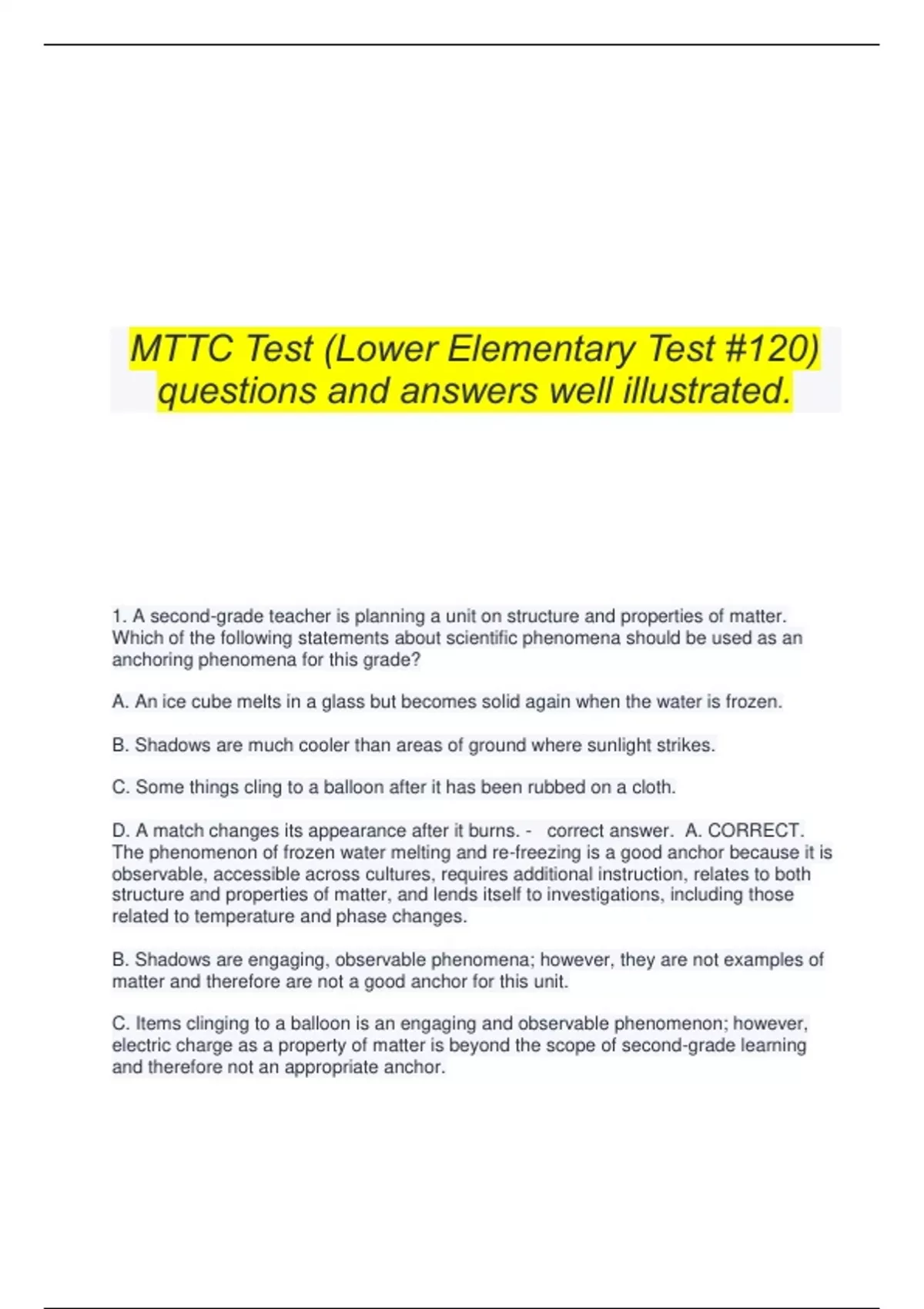 MTTC Test (Lower Elementary Test #120) questions and answers well illustrated. 1. A second-grade teacher is planning a unit on structure and properties of matter. Which of the following statements about scientific phenomena should be used as an anchoring phenomena for this grade? A. An ice cube melts in a glass but becomes solid again when the water is frozen. B. Shadows are much cooler than areas of ground where sunlight strikes. C. Some things cling to a balloon after it has been rubbed on a cloth. D. A match changes its appearance after it burns. - correct answer. A. CORRECT. The phenomenon of frozen water melting and re-freezing is a good anchor because it is observable, accessible across cultures, requires additional instruction, relates to both structure and properties of matter, and lends itself to investigations, including those related to temperature and phase changes. B. Shadows are engaging, observable phenomena; however, they are not examples of matter and therefore are not a good anchor for this unit. C. Items clinging to a balloon is an engaging and observable phenomenon; however, electric charge as a property of matter is beyond the scope of second-grade learning and therefore not an appropriate anchor. D. The change in a match after burning is an interesting and observable phenomenon; however, it would fit best in a unit on physical and chemical changes, rather than in an introduction to structure and properties of matter, and it would be more appropriate for older students than for second-grade students. 2. A kindergarten science classroom investigates changing the speed and direction of an object with a push or a pull. Which of the following activities most appropriately supports the students in analyzing and interpreting data? A. comparing different observations of what occurred B. distinguishing between opinions and evidence in an argument C. describing how specific images support a scientific explanation D. making valid claims to determine an optimal design solution to a problem - correct answer. A. CORRECT. This investigation offers students the opportunity to observe how the speed and/or direction of an object changes with a push or a pull (e.g., pushing or pulling a toy car with various amounts of force). The descriptions of what they observed and the comparisons of different outcomes provide data that can be used for interpretation and analysis with the help of the teacher. B. The concept of change due to force is the focus of the lesson and, while opinions and evidence will be discussed, distinguishing them isn't the result of analyzing the data. In this scenario, students are more engaged in the practice of argument. C. Students are working with objects in this lesson, not viewing images, and they are working toward the practice of developing an explanation. D. Students are investigating how speed and direction can change, but not in reference to a specific goal, such as designing an optimal solution. This scenario is more about the practices of engaging in argument and designing solutions than in analyzing and interpreting data. 3. Students in a third-grade science class make claims about how a prototype design that they made for a weather-related problem works. This activity matches which of the following disciplinary core ideas? A. wave properties B. natural resources C. developing possible solutions D. defining and delimiting engineering problems - correct answer. A. Third-grade students should not yet be learning about wave properties, which would include discussions of amplitude, frequency, and wavelength. Moreover, these properties only relate to weather tangentially. B. While weather is a naturally occurring phenomenon and so might be considered a natural resource, this concept is not helpful in designing solutions for a weather-related problem. C. CORRECT. Communicating with other students about their prototypes is an important part of the developing possible solutions portion of the engineering design process and aids in the development of ideas, including generating improvements. D. The students should have already completed defining and delimiting their current engineering problems because they are described as being at the point of making claims about how their prototypes work. 4. Which of the following activities effectively integrates the patterns crosscutting concept into a first-grade space systems unit? A. recording information to describe how much light is available on a given day B. providing evidence of objects only being seen when they are illuminated C. observing the sun, moon, and stars to predict daily and monthly events D. communicating solutions to reduce the amount of junk orbiting Earth - correct answer. A. Examining only one day's data will not provide enough information to find a pattern because multiple data points are needed. B. Providing evidence in this way relates better to the crosscutting concept of cause and effect because being seen relies on the illumination of an object. C. CORRECT. By making observations and learning about the sun, moon, and stars, students can learn to recognize patterns, such as predicting the visible shape of the moon over time, as well as the positions of various celestial objects. D. Examining the amount of junk orbiting Earth relates better to scale, proportion, and quantity because it involves amounts of things. 5. Prekindergarten children explore the concepts of sinking and floating by placing items in water. Which of the following supplies would best support this investigation? A. plastic building blocks that are different colors B. classroom objects made of different materials C. different-sized bottles with various types of liquid inside D. fish tanks with sizes that have varying depths and volumes - correct answer. A. The blocks' color is not directly related to whether it can sink or float. B. CORRECT. By exploring sinking and floating with objects made of different materials (e.g., a wood