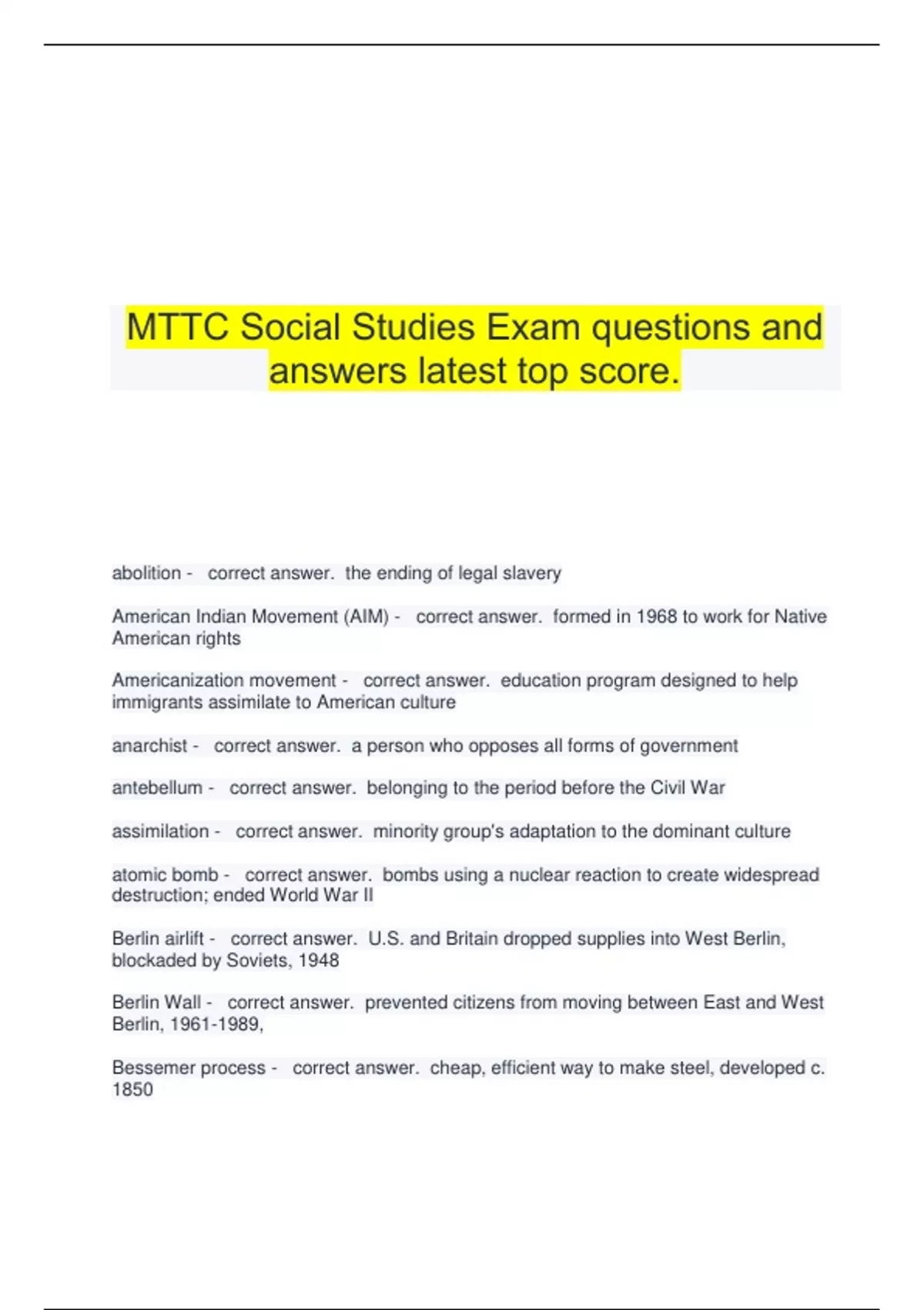 MTTC Social Studies Exam questions and answers latest top score. abolition - correct answer. the ending of legal slavery American Indian Movement (AIM) - correct answer. formed in 1968 to work for Native American rights Americanization movement - correct answer. education program designed to help immigrants assimilate to American culture anarchist - correct answer. a person who opposes all forms of government antebellum - correct answer. belonging to the period before the Civil War assimilation - correct answer. minority group's adaptation to the dominant culture atomic bomb - correct answer. bombs using a nuclear reaction to create widespread destruction; ended World War II Berlin airlift - correct answer. U.S. and Britain dropped supplies into West Berlin, blockaded by Soviets, 1948 Berlin Wall - correct answer. prevented citizens from moving between East and West Berlin, , Bessemer process - correct answer. cheap, efficient way to make steel, developed c. 1850 big stick diplomacy - correct answer. U.S. foreign policy of Pres. Theodore Roosevelt which used threats of military intervention to exert influence over other countries, especially in protecting U.S. interests in Latin America black codes - correct answer. laws, in Southern states after the Civil War, to limit rights of African Americans blacklist - correct answer. names of people barred from working in Hollywood because of alleged Communist connections Black Panthers - correct answer. militant political organization to combat police brutality and provide services in African-American ghettos, founded 1966 Black Power - correct answer. slogan revived by Stokely Carmichael in the 1960s to encourage black pride and leadership Bleeding Kansas - correct answer. description of the antebellum Kansas Territory, due to conflict over slavery bootlegger - correct answer. smuggler of illegal alcoholic beverages during Prohibition boycott - correct answer. refusal to have economic relations with a person or group buying on margin - correct answer. purchasing stocks or bonds on credit capitalism - correct answer. economic system in which private individuals and corporations control the means of production and earn profit on them cash crop - correct answer. one grown for sale rather than personal use Cold War - correct answer. period of tension between U.S. and USSR, colonization - correct answer. establishment of outlying settlements by a parent country Columbian Exchange - correct answer. movement of plants, animals, and disease between the Americas and Europe after Columbus's voyage communism - correct answer. political and economic philosophy of one party government and state ownership of property concentration camp - correct answer. prison camp operated by Nazi Germany in which Jews and other minorities were murdered or forced into slave labor confederation - correct answer. alliance of states or nations acting together for mutual benefit consumerism - correct answer. preoccupation with purchasing material goods containment - correct answer. blocking of a nation's attempt to spread its influence, especially attempts to spread communism after World War II counterculture - correct answer. American youth in the 1960s opposed to mainstream culture; based on peace, love, individual freedom D-Day - correct answer. Allied invasion of mainland Europe June 6, 1944 debt peonage - correct answer. workers bound in servitude until debts are paid de facto segregation - correct answer. racial separation based on custom rather than law deficit spending - correct answer. government spending that exceeds revenue de jure segregation - correct answer. racial separation based on law demographic - correct answer. having to do with population depression - correct answer. very severe and prolonged contraction of economic activity dollar diplomacy - correct answer. U.S. foreign policy of using the nation's economic power to exert influence over other countries; use first associated with Pres. Taft domino theory - correct answer. belief that if one country falls to communism its neighbors will double standard - correct answer. granting greater sexual freedom to men than to women dove - correct answer. opponent of U.S. participation in Vietnam War draft - correct answer. legally required military service Dust Bowl - correct answer. areas of Colorado, New Mexico, Kansas, Oklahoma, and Texas hard-hit by drought and dust storms, 1930s electoral college - correct answer. group selected by states to elect president and vice-president; number of electors equals Congressional representation of each state emancipation - correct answer. freeing of slaves Enlightenment - correct answer. 18th-century intellectual movement that emphasized the use of reason and the scientific method as means of obtaining knowledge environmentalist - correct answer. a person who works to protect the environment executive branch - correct answer. administers and enforces laws fascism - correct answer. political philosophy that advocates centralized dictatorial nationalistic government Federal Deposit Insurance Corporation - correct answer. created in 1933 to insure bank deposits against loss Federalist—supporter of the Constitution and strong national government free enterprise - correct answer. economic system based on private property, free markets, and individuals making most economic decisions fundamentalism - correct answer. Protestant religious movement based on belief in literal truth of the Bible genocide - correct answer. deliberate and systematic extermination of a particular ethnic, national, or religious group Gentlemen's Agreement - correct answer. Japanese government agreed to limit emigration to the U.S., GI Bill of Rights - correct answer. 1944 law that gave financial and education benefits to World War II veterans gold standard - correct answer. monetary system in which a country's currency is valued at a fixed sum of gold grandfather clause - correct answer. exempted Southern