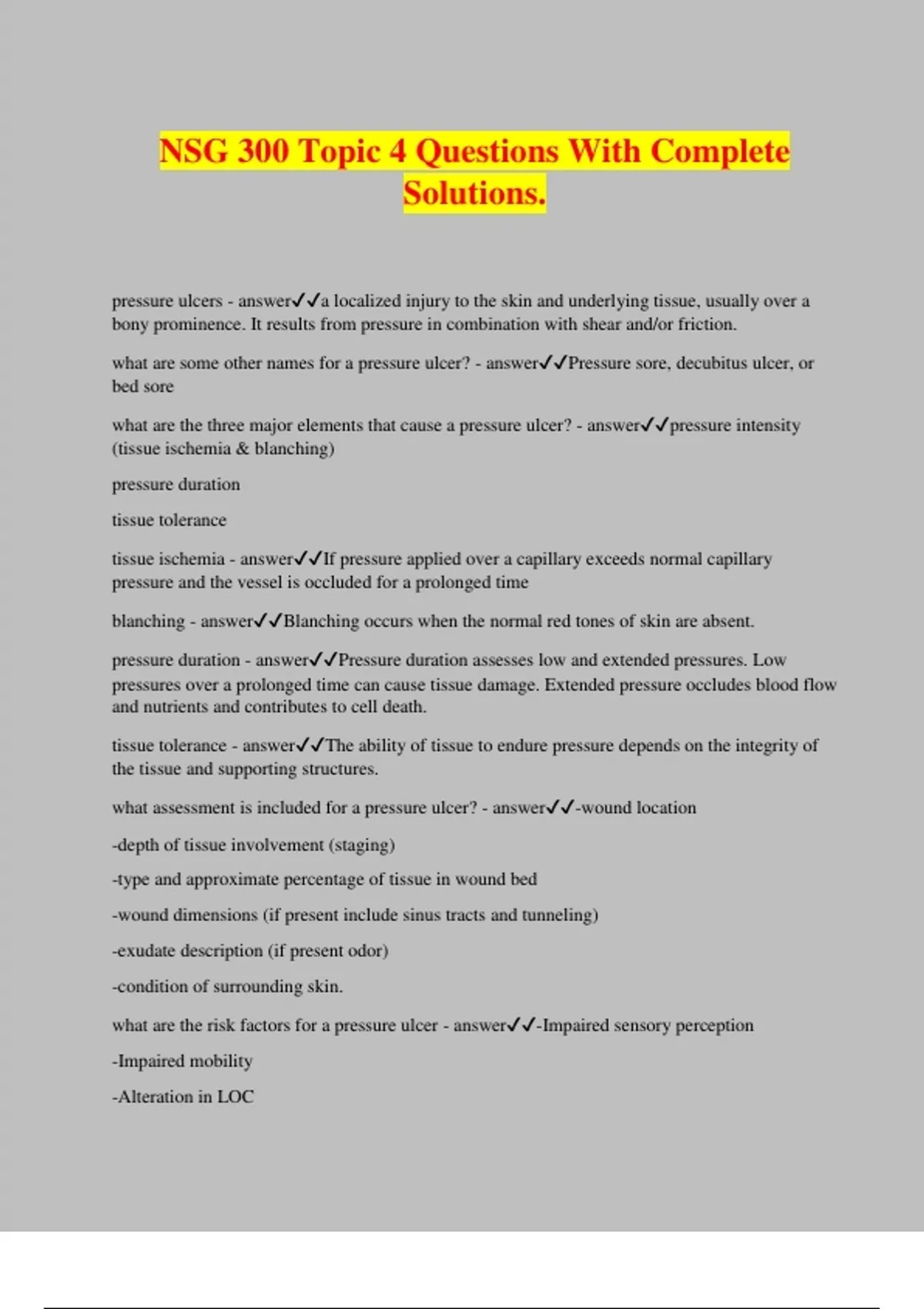 NSG 300 Topic 4 Questions With Complete Solutions. pressure ulcers - answera localized injury to the skin and underlying tissue, usually over a bony prominence. It results from pressure in combination with shear and/or friction. what are some other names for a pressure ulcer? - answerPressure sore, decubitus ulcer, or bed sore what are the three major elements that cause a pressure ulcer? - answerpressure intensity (tissue ischemia & blanching) pressure duration tissue tolerance tissue ischemia - answerIf pressure applied over a capillary exceeds normal capillary pressure and the vessel is occluded for a prolonged time blanching - answerBlanching occurs when the normal red tones of skin are absent. pressure duration - answerPressure duration assesses low and extended pressures. Low pressures over a prolonged time can cause tissue damage. Extended pressure occludes blood flow and nutrients and contributes to cell death. tissue tolerance - answerThe ability of tissue to endure pressure depends on the integrity of the tissue and supporting structures. what assessment is included for a pressure ulcer? - answer-wound location -depth of tissue involvement (staging) -type and approximate percentage of tissue in wound bed -wound dimensions (if present include sinus tracts and tunneling) -exudate description (if present odor) -condition of surrounding skin. what are the risk factors for a pressure ulcer - answer-Impaired sensory perception -Impaired mobility -Alteration in LOC -Shear -Friction -Moisture stage I - answero Intact skin with nonblanchable redness of a localized area usually over a bony prominence -Discoloration of the skin, warmth, edema, hardness, or pain may also be present. stage II - answero Partial-thickness skin loss involving epidermis, dermis, or both -Presenting as a shallow open ulcer with a red pink wound bed, without slough. -May also present as an intact or op