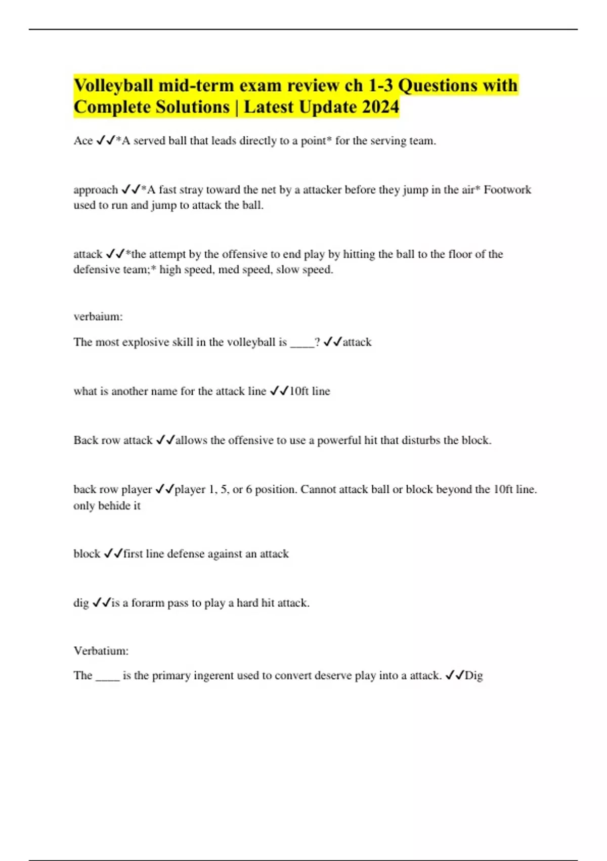 Volleyball mid-term exam review ch 1-3 Questions with Complete Solutions | Latest Update 2024