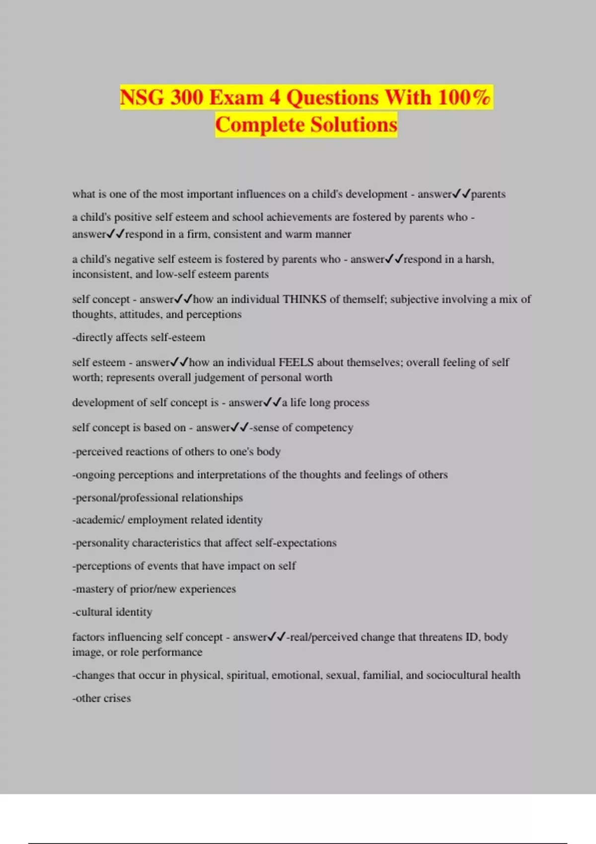 NSG 300 Exam 4 Questions With 100% Complete Solutions what is one of the most important influences on a child's development - answerparents a child's positive self esteem and school achievements are fostered by parents who - answerrespond in a firm, consistent and warm manner a child's negative self esteem is fostered by parents who - answerrespond in a harsh, inconsistent, and low-self esteem parents self concept - answerhow an individual THINKS of themself; subjective involving a mix of thoughts, attitudes, and perceptions -directly affects self-esteem self esteem - answerhow an individual FEELS about themselves; overall feeling of self worth; represents overall judgement of personal worth development of self concept is - answera life long process self concept is based on - answer-sense of competency -perceived reactions of others to one's body -ongoing perceptions and interpretations of the thoughts and feelings of others -personal/professional relationships -academic/ employment related identity -personality characteristics that affect self-expectations -perceptions of events that have impact on self -mastery of prior/new experiences -cultural identity factors influencing self concept - answer-real/perceived change that threatens ID, body image, or role performance -changes that occur in physical, spiritual, emotional, sexual, familial, and sociocultural health -other crises Erikson's Psychosocial Theory - answereach stage builds on tasks of the previous stage, successful mastery leads to sense of self Infancy (Erikson stage) - answertrust vs mistrust early childhood (Erikson stage) - answerautonomy vs shame and doubt preschool (Erikson stage) - answerInitiative vs. guilt; Show independence...line leader! school age (Erikson stage) - answerindustry vs inferiority adolescence (Erikson stage) - answeridentity vs role confusion young adulthood (Erikson stage) - answerintimacy vs isolation middle adulthood (Erikson stage) - answergenerativity vs stagnation maturity (Erikson stage) - answerego integrity vs despair Nurse's Effect on Patient's Self-Concept - answer-remain aware of own feelings, ideas, values, expectations, and judgments -use pos. and matter of fact approach -build trusting relationship -be aware of facial/body expression components of self concept - answer-identity -body image -role performance identity confusion occurs when - answerthere is an inability to adapt to identity stressors role performance stressors - answer-role conflict -role ambiguity -role strain -role overload identity - answerinternal sense of individuality, wholeness, and consistency of a person over time body image - answerinvolves attitudes related to physical appearance, structure, or function role performance - answerrole conflict, role