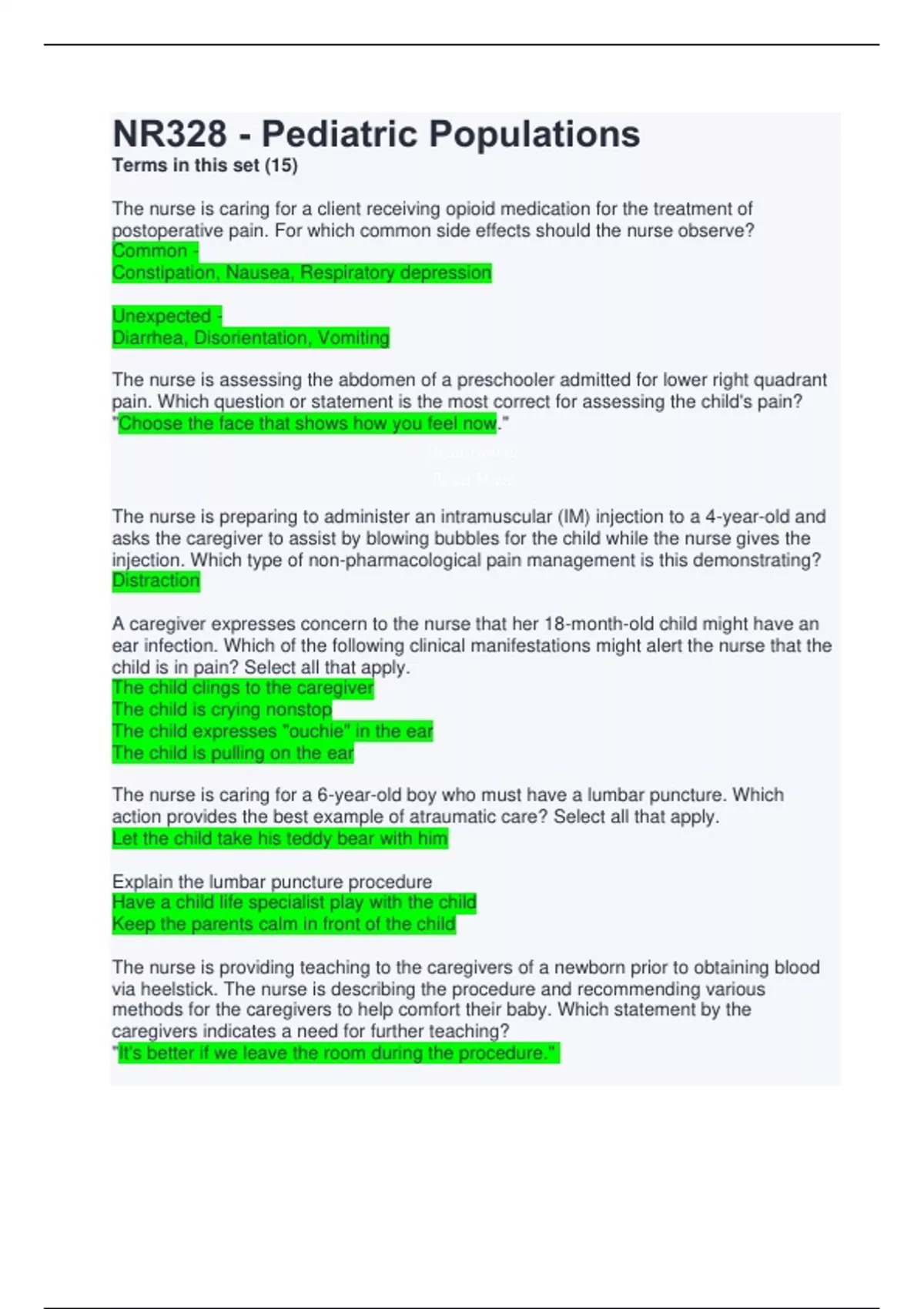 Terms in this set (15) The nurse is caring for a client receiving opioid medication for the treatment of postoperative pain. For which common side effects should the nurse observe? Common - Constipation, Nausea, Respiratory depression Unexpected - Diarrhea, Disorientation, Vomiting The nurse is assessing the abdomen of a preschooler admitted for lower right quadrant pain. Which question or statement is the most correct for assessing the child's pain? "Choose the face that shows how you feel now." Brainpower Read More The nurse is preparing to administer an intramuscular (IM) injection to a 4-year-old and asks the caregiver to assist by blowing bubbles for the child while the nurse gives the injection. Which type of non-pharmacological pain management is this demonstrating? Distraction A caregiver expresses concern to the nurse that her 18-month-old child might have an ear infection. Which of the following clinical manifestations might alert the nurse that the child is in pain? Select all that apply. The child clings to the caregiver The child is crying nonstop The child expresses "ouchie" in the ear The child is pulling on the ear The nurse is caring for a 6-year-old boy who must have a lumbar puncture. Which action provides the best example of atraumatic care? Select all that apply. Let the child take his teddy bear with him Explain the lumbar puncture procedure Have a child life specialist play with the child Keep the parents calm in front of the child The nurse is providing teaching to the caregivers of a newborn prior to obtaining blood via heelstick. The nurse is describing the procedure and recommending various methods for the caregivers to help comfort their baby. Which statement by the caregivers indicates a need for further teaching? "It's better if we leave the room during the procedure."