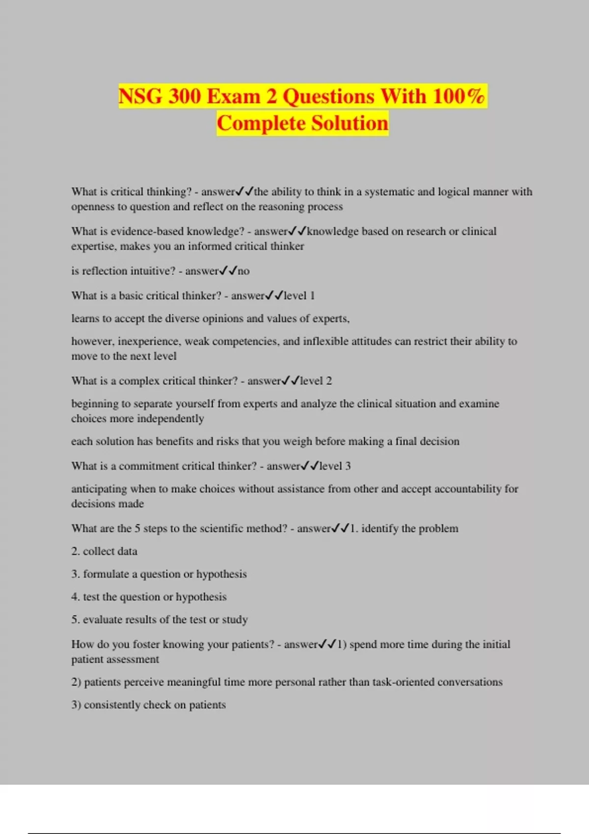 NSG 300 Exam 2 Questions With 100% Complete Solution What is critical thinking? - answerthe ability to think in a systematic and logical manner with openness to question and reflect on the reasoning process What is evidence-based knowledge? - answerknowledge based on research or clinical expertise, makes you an informed critical thinker is reflection intuitive? - answerno What is a basic critical thinker? - answerlevel 1 learns to accept the diverse opinions and values of experts, however, inexperience, weak competencies, and inflexible attitudes can restrict their ability to move to the next level What is a complex critical thinker? - answerlevel 2 beginning to separate yourself from experts and analyze the clinical situation and examine choices more independently each solution has benefits and risks that you weigh before making a final decision What is a commitment critical thinker? - answerlevel 3 anticipating when to make choices without assistance from other and accept accountability for decisions made What are the 5 steps to the scientific method? - answer1. identify the problem 2. collect data 3. formulate a question or hypothesis 4. test the question or hypothesis 5. evaluate results of the test or study How do you foster knowing your patients? - answer1) spend more time during the initial patient assessment 2) patients perceive meaningful time more personal rather than task-oriented conversations 3) consistently check on patients 4) ask to have the same patient assigned to you over consecutive days What is the 5 step nursing process model? - answerassessment diagnosis outcome planning implementation evaluation Describe the assessment step in the nursing process: - answergathering information about the patient's condition Describe the diagnosis step in the nursing process: - answeridentifying the patient's problems Describe the planning step in the nursing process: - answersetting goals of care and desired outcomes and identifying appropriate nu