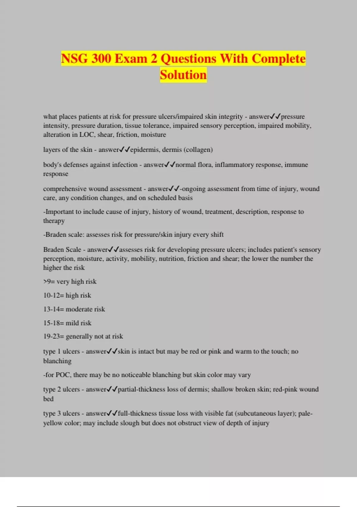 NSG 300 Exam 2 Questions With Complete Solution what places patients at risk for pressure ulcers/impaired skin integrity - answerpressure intensity, pressure duration, tissue tolerance, impaired sensory perception, impaired mobility, alteration in LOC, shear, friction, moisture layers of the skin - answerepidermis, dermis (collagen) body's defenses against infection - answernormal flora, inflammatory response, immune response comprehensive wound assessment - answer-ongoing assessment from time of injury, wound care, any condition changes, and on scheduled basis -Important to include cause of injury, history of wound, treatment, description, response to therapy -Braden scale: assesses risk for pressure/skin injury every shift Braden Scale - answerassesses risk for developing pressure ulcers; includes patient's sensory perception, moisture, activity, mobility, nutrition, friction and shear; the lower the number the higher the risk >9= very high risk 10-12= high risk 13-14= moderate risk 15-18= mild risk 19-23= generally not at risk type 1 ulcers - answerskin is intact but may be red or pink and warm to the touch; no blanching -for POC, there may be no noticeable blanching but skin color may vary type 2 ulcers - answerpartial-thickness loss of dermis; shallow broken skin; red-pink wound bed type 3 ulcers - answerfull-thickness tissue loss with visible fat (subcutaneous layer); pale- yellow color; may include slough but does not obstruct view of depth of injury type 4 ulcers - answerfull-thickness tissue loss with exposed bone, muscle, or tendon. possible tunneling and undermining unstageable pressure ulcer - answerbase of ulcer covered by slough and/or eschar in the wound bed so the depth is unknown; exudate; deep tissue injury - answerPurple or maroon localized area of discolored intact skin or blood- filled blister due to damage of underlying soft tissue from pressure and/or shear. how should you clean a wound - answerfrom least to most contaminated eschar - answerblack, brown or necrotic tissue in wound bed; needs to be removed before healing slough - answerstringy pale-yellowish tissue that lays in the wound bed; needs to be removed before healing if a patient has slough, eschar, and infectious exudate which one would you be most concerned about - answerinfectious exudate factors influencing heat and cold tolerance - answerExposure time Exposed skin Temperature Age Perception of sensory stimuli assessment for pressure ulcers includes - answerlocation, staging (depth), type and % of tissue in wound bed, wound dimensions