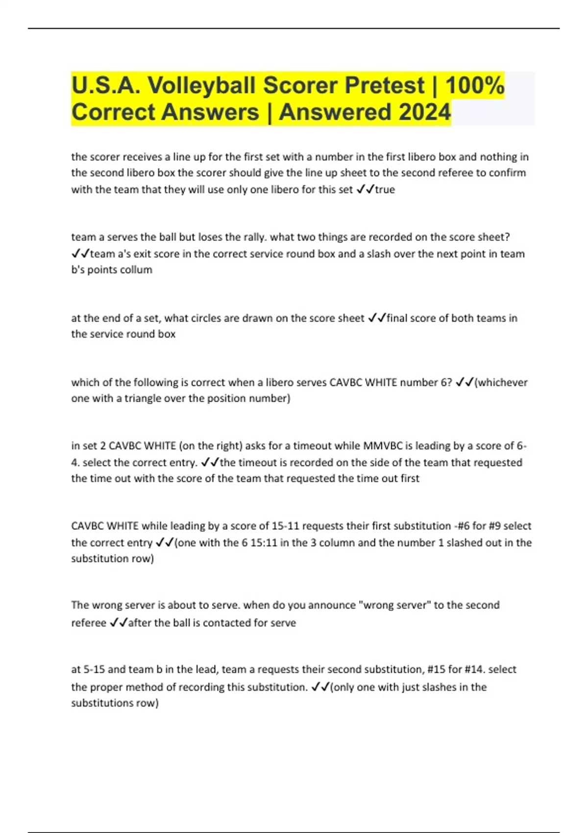 U.S.A. Volleyball Scorer Pretest | 100% Correct Answers | Answered 2024