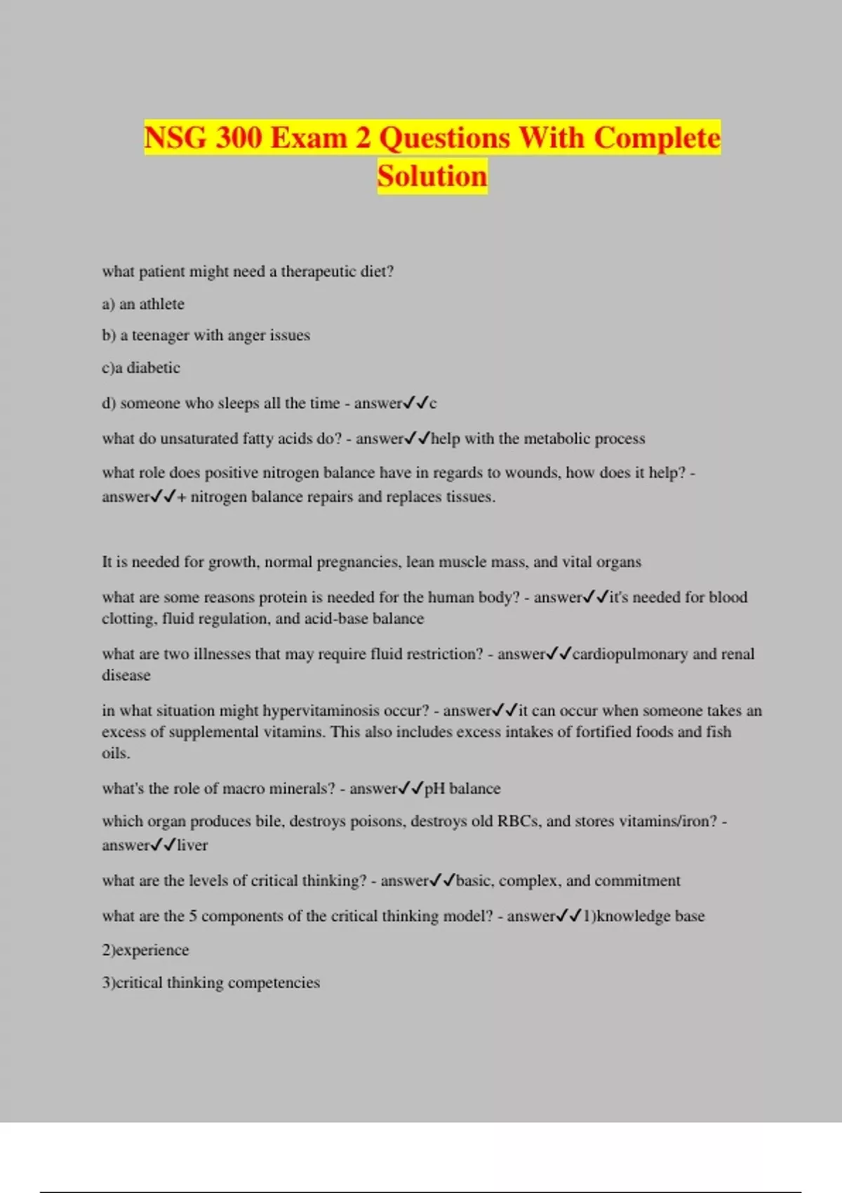 NSG 300 Exam 2 Questions With Complete Solution what patient might need a therapeutic diet? a) an athlete b) a teenager with anger issues c)a diabetic d) someone who sleeps all the time - answerc what do unsaturated fatty acids do? - answerhelp with the metabolic process what role does positive nitrogen balance have in regards to wounds, how does it help? - answer+ nitrogen balance repairs and replaces tissues. It is needed for growth, normal pregnancies, lean muscle mass, and vital organs what are some reasons protein is needed for the human body? - answerit's needed for blood clotting, fluid regulation, and acid-base balance what are two illnesses that may require fluid restriction? - answercardiopulmonary and renal disease in what situation might hypervitaminosis occur? - answerit can occur when someone takes an excess of supplemental vitamins. This also includes excess intakes of fortified foods and fish oils. what's the role of macro minerals? - answerpH balance which organ produces bile, destroys poisons, destroys old RBCs, and stores vitamins/iron? - answerliver what are the levels of critical thinking? - answerbasic, complex, and commitment what are the 5 components of the critical thinking model? - answer1)knowledge base 2)experience 3)critical thinking competencies 4)attitudes 5)standards the stomach.... - answer-stores, churns, and breaks food -Hcl activates enzymes -kills germs what are the normal lab values for sodium (Na+)? - answer136-145 mEq/L (136-145 mmol/L) What are the normal pH ranges according to the book? - answer7.35-7.45 What are the normal lab values for potassium? - answer3.5-5.0 mEq/L (3.5-5 mmol/L) role of a nurse clinical executive - answerclinical/business leader who is concerned with maximizing quality of care and cost effectiveness while maintaining relationships and professional satisfaction of the st