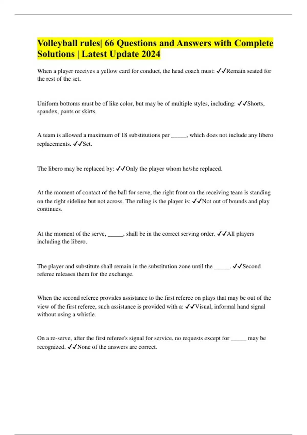Volleyball rules| 66 Questions and Answers with Complete Solutions | Latest Update 2024
