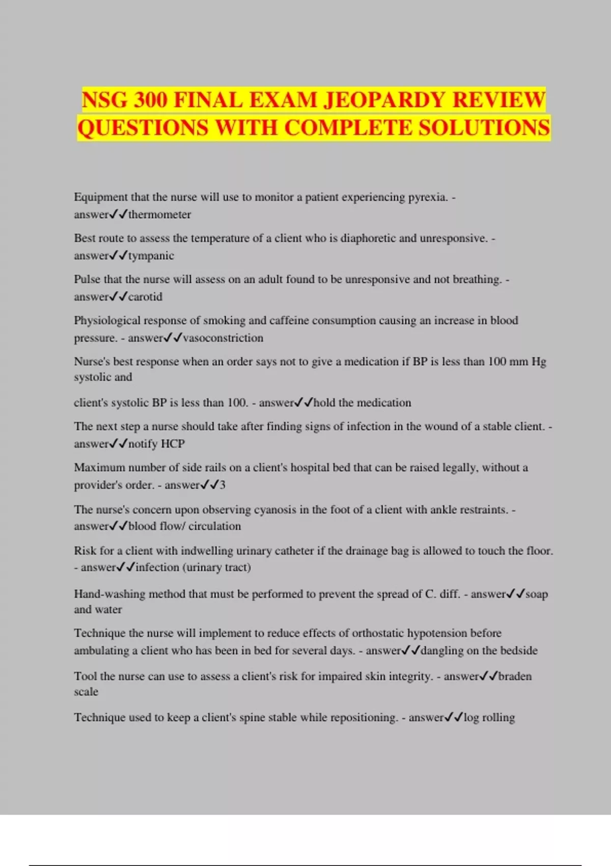 NSG 300 FINAL EXAM JEOPARDY REVIEW QUESTIONS WITH COMPLETE SOLUTIONS Equipment that the nurse will use to monitor a patient experiencing pyrexia. - answerthermometer Best route to assess the temperature of a client who is diaphoretic and unresponsive. - answertympanic Pulse that the nurse will assess on an adult found to be unresponsive and not breathing. - answercarotid Physiological response of smoking and caffeine consumption causing an increase in blood pressure. - answervasoconstriction Nurse's best response when an order says not to give a medication if BP is less than 100 mm Hg systolic and client's systolic BP is less than 100. - answerhold the medication The next step a nurse should take after finding signs of infection in the wound of a stable client. - answernotify HCP Maximum number of side rails on a client's hospital bed that can be raised legally, without a provider's order. - answer3 The nurse's concern upon observing cyanosis in the foot of a client with ankle restraints. - answerblood flow/ circulation Risk for a client with indwelling urinary catheter if the drainage bag is allowed to touch the floor. - answerinfection (urinary tract) Hand-washing method that must be performed to prevent the spread of C. diff. - answersoap and water Technique the nurse will implement to reduce effects of orthostatic hypotension before ambulating a client who has been in bed for several days. - answerdangling on the bedside Tool the nurse can use to assess a client's risk for impaired skin integrity. - answerbraden scale Technique used to keep a client's spine stable while repositioning. - answerlog rolling Tool the nurse can use to assess a client's risk for falling. - answermorse scale Method for cleaning a contaminated body area to prevent spreading infection. - answerleast to most contaminated Condition for which impaired sensory perception, impaired mobility, shear, friction, and moisture are risk factors. - answerpressure ulcer development/impaired skin integrity Abnormal elimination that places a client at ris