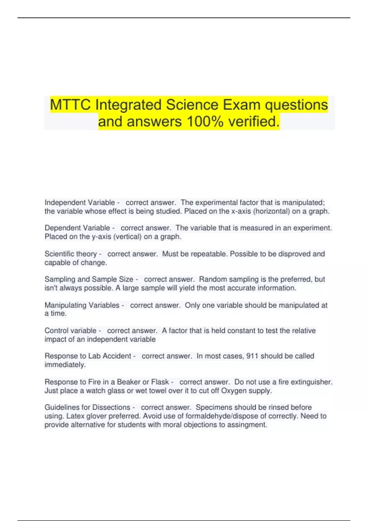 MTTC Integrated Science Exam questions and answers 100% verified. Independent Variable - correct answer. The experimental factor that is manipulated; the variable whose effect is being studied. Placed on the x-axis (horizontal) on a graph. Dependent Variable - correct answer. The variable that is measured in an experiment. Placed on the y-axis (vertical) on a graph. Scientific theory - correct answer. Must be repeatable. Possible to be disproved and capable of change. Sampling and Sample Size - correct answer. Random sampling is the preferred, but isn't always possible. A large sample will yield the most accurate information. Manipulating Variables - correct answer. Only one variable should be manipulated at a time. Control variable - correct answer. A factor that is held constant to test the relative impact of an independent variable Response to Lab Accident - correct answer. In most cases, 911 should be called immediately. Response to Fire in a Beaker or Flask - correct answer. Do not use a fire extinguisher. Just place a watch glass or wet towel over it to cut off Oxygen supply. Guidelines for Dissections - correct answer. Specimens should be rinsed before using. Latex glover preferred. Avoid use of formaldehyde/dispose of correctly. Need to provide alternative for students with moral objections to assingment. Storing Lab Chemicals - correct answer. Store all in secured, dry area. Acids locked in separate area. Origin of Biological Sciences - correct answer. Traced back to ancient Greeks (i.e. Aristotle) Andrea Vesalius - correct answer. Dissected human bodies; created a book on anatomy Anton van Leeuwenhoek - correct answer. Father of Microscopy, first to see and describe bacteria, yeast plants, and microscopic life found in water Scanning Electron Microscope (SEM) - correct answer. Instead of a light, a beam of electrons pass through specimen. Resolution about 1,000 times greater than light microscope. Will kill specimen though. Robert Hooke - correct answer. Famous for Hook's law describing elasticity. But called a "virtuoso", able to contribute findings to any major field in science Carl Von Linnaeus - correct answer. Famous for binomial system of nomenclature. Each living organism has two names, a genus and species. Considered father of modern ecology and taxonomy Pasteur - correct answer. Discovered role of microorganisms in the cause of disease, pasteurization, and rabies vaccine. Koch's Postulates - correct answer. Specific diseases caused by specific pathogens Cell theory - correct answer. Cell is the common structural unit in plants and animals. Proposed by Mattias Scheleiden and Schwann. Watson and Crick - correct answer. Discovered the structure of DNA was a double helix (in the 1950s). Made it possible to understand how DNA replicated and synthesized proteins Commonalities Among all Sciences - correct answer. - Systems, order, and organization - Evidence, models, and explanation - Constancy, change, and measurement - Evolution and equilibrium - Form and function Empirical Evidence - correct answer. All evidence is empirical; all evidence must be observed by the five sense. Peer-reviewed Journals - correct answer. Most accepted source for information on scientific experiments and studies Air Pollution - correct answer. Chemicals in the air; include carbon monoxide, sulfur dioxide, and chlorofluorocarbons (CFC's) Water Pollution - correct answer. Contaminants enter water by ground runoff or by leaching Thermal pollution - correct answer. Factories dump water at high temperatures which increases normal water temperatures. This means the water can hold less gas, disrupting the ecosystem Greenhouse gasses - correct answer. I.e. carbon dioxide and nitrous oxide. Concentration of them is increased by burning fossil fuels. These gasses absorb and trap heat, therefore warming the planet Acid ran - correct answer. Sulfur and nitrous oxides converted to acids and contaminate water supplies Prokaryotes - correct answer. Single-celled organisms that do not have a membrane-bound nucleus Flagella - correct answer. Appendages on bacteria cells; used for movement Pili - correct answer. Used by bacteria cells to attach to other cells Cell Wall - correct answer. a thin membrane around the cytoplasm of a cell Cell membrane - correct answer. a phospholipid layer that covers a cell's surface and acts as a barrier between the inside of a cell and the cell's environment Eukaryotes - correct answer. organisms whose cells contain a nucleus and other membrane bound organelles Nucleus - correct answer. a part of the cell containing DNA and RNA and responsible for growth and reproduction Nucleolus - correct answer. The organelle where ribosomes are made, synthesized and partially assembled, located in the nucleus Ribosomes - correct answer. site of protein synthesis Endoplasmic Reticulum - correct answer. an internal membrane system in which components of cell membrane and some proteins are constructed Golgi apparatus - correct answer. stack of membranes in the cell that modifies, sorts, and packages proteins from the endoplasmic reticulum Lysosomes - correct answer. An organelle containing digestive enzymes; found mostly in animal cells Mitochondria - correct answer. Powerhouse of the cell, organelle that is the site of ATP (energy) production Plastids - correct answer. Include chloroplasts, chromoplasts, and amyloplasts (leucoplasts); only found in photosynthetic organisms Vacuoles - correct answer. saclike structures that store materials such as water, salts, proteins, and carbohydrates Cytoskeleton - correct answer. network of protein filaments within some cells that helps the cell maintain its shape and is involved in many forms of cell movement; made up of microtubles, intermediate filaments, and microfilaments Archaea - correct answer. Single-celled, no nucleus, Live in harsh condisions, oldest organisms on earth Animal vs Plant Cells - correct answer. Animal cells have centrioles (plant cells
