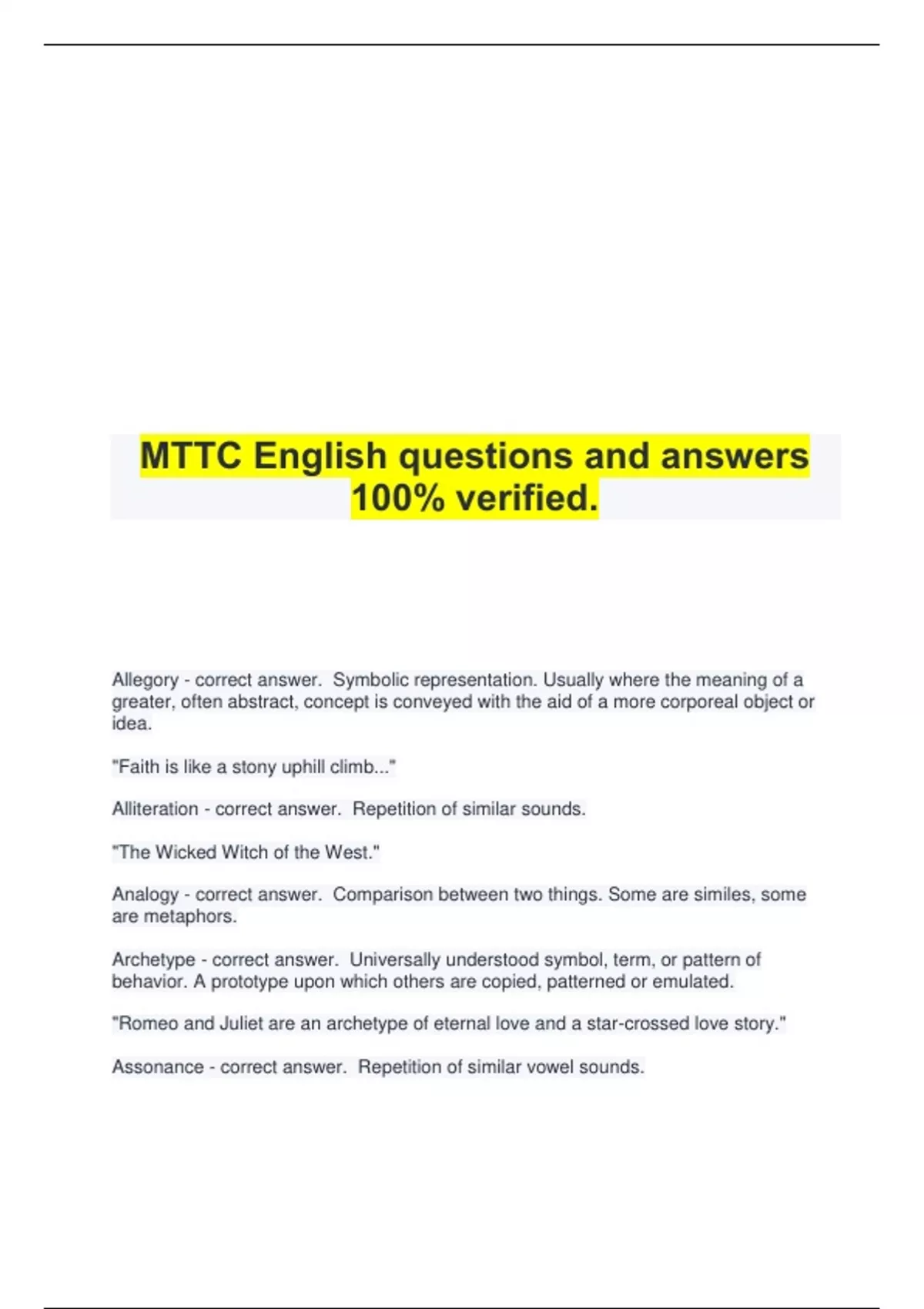 MTTC English questions and answers 100% verified. Allegory - correct answer. Symbolic representation. Usually where the meaning of a greater, often abstract, concept is conveyed with the aid of a more corporeal object or idea. "Faith is like a stony uphill climb..." Alliteration - correct answer. Repetition of similar sounds. "The Wicked Witch of the West." Analogy - correct answer. Comparison between two things. Some are similes, some are metaphors. Archetype - correct answer. Universally understood symbol, term, or pattern of behavior. A prototype upon which others are copied, patterned or emulated. "Romeo and Juliet are an archetype of eternal love and a star-crossed love story." Assonance - correct answer. Repetition of similar vowel sounds. Connotation - correct answer. Secondary meaning of a word. Goes beyond literal or dictionary meaning. Consonance - correct answer. Repetition of similar constant sounds. Denotation - correct answer. Dictionary definition of a word or literal meaning. Diction - correct answer. Style of speaking or writing as dependent upon choice of words. Some modern day writers use terms such as 'thy', 'thee' and 'wherefore' to imbue a Shakespearean mood to their work. Epilogue - correct answer. Afterword after the last chapter is over. Epithet - correct answer. Descriptive device that usually adds to a person or place's regular name. "Alexander the Great" is an epithet refering to Alexander III of Macedon. Euphemism - correct answer. Using a milder form of a negative description instead of its original. Usually about sex, crimes, violence, "embarrassing" things... Hyperbole - correct answer. Exaggeration. Litote - correct answer. Understatement. Way of saying something unpleasant without directly using negativity. "He's definitely not a rocket scientist" instead of "He is not smart." Malapropism - correct answer. Practice of substituting words to convey the speaker is flustered or confused. "Our watch, sir, have indeed comprehended two auspicious persons" instead of "Our watch, sir, have indeed apprehended two suspicious persons." Metaphor - correct answer. Comparison in which one thing said to be another. Motif - correct answer. Element, subject, idea or concept that is constantly present through the piece. "A handsome prince falling in love with a damsel in distress." Onomatopoeia - correct answer. Words that imitate sounds they describe. Simile - correct answer. Comparison using "like" or "as." Spoonerism - correct answer. Interchanging the first letters of some words to create a humorous setting. Syntax - correct answer. Study of the parts of speech; the structure of sentences and what determines which words go where Semantics - correct answer. The study of meaning; how the way in which words are put together creates meaning Phonology - correct answer. Study of the sound of languages; how speech sounds are used to convey meaning Morphology - correct answer. "Mental dictionary"; mental system of rules that helps us form and understand words Epic Poetry - correct answer. Long narrative telling the story of a hero, usually taking a journey of great mythic or historical significance "Beowulf," John Milton's "Paradise Lost," and Edmund Spenser's "The Faerie Queene" Dramatic Poetry - correct answer. An imagined, single speaker addresses a silent listener, usually not the reader Couplet - correct answer. A pair of successive rhyming lines, usually of the same length Closed Couplet - correct answer. When the pair of lines in a couplet form a sentence Sonnet - correct answer. Poem of 14 lines with a set rhyme scheme that varies, brought to England by Sir Thomas Wyatt and Henry Howard English (or Shakespearean), Italian, and Petrarchan sonnet types Ballad - correct answer. Form of poetry in a narrative song, usually sung John Keats's "La Belle Dame sans Merci," Thomas Hardy's "During Wind and Rain," and Edgar Allan Poe's "Annabel Lee" Biographical, deconstructionist, feminist, formalist, historical, mythological, psychological, reader-response, sociological - correct answer. Types of criticism Formalist/New Criticism - correct answer. Approach that analyzes the inherent features of a text. Focus is not on author, historical context, or our own rxns, but on the text itself. Focus on things like grammar, symbols, images...