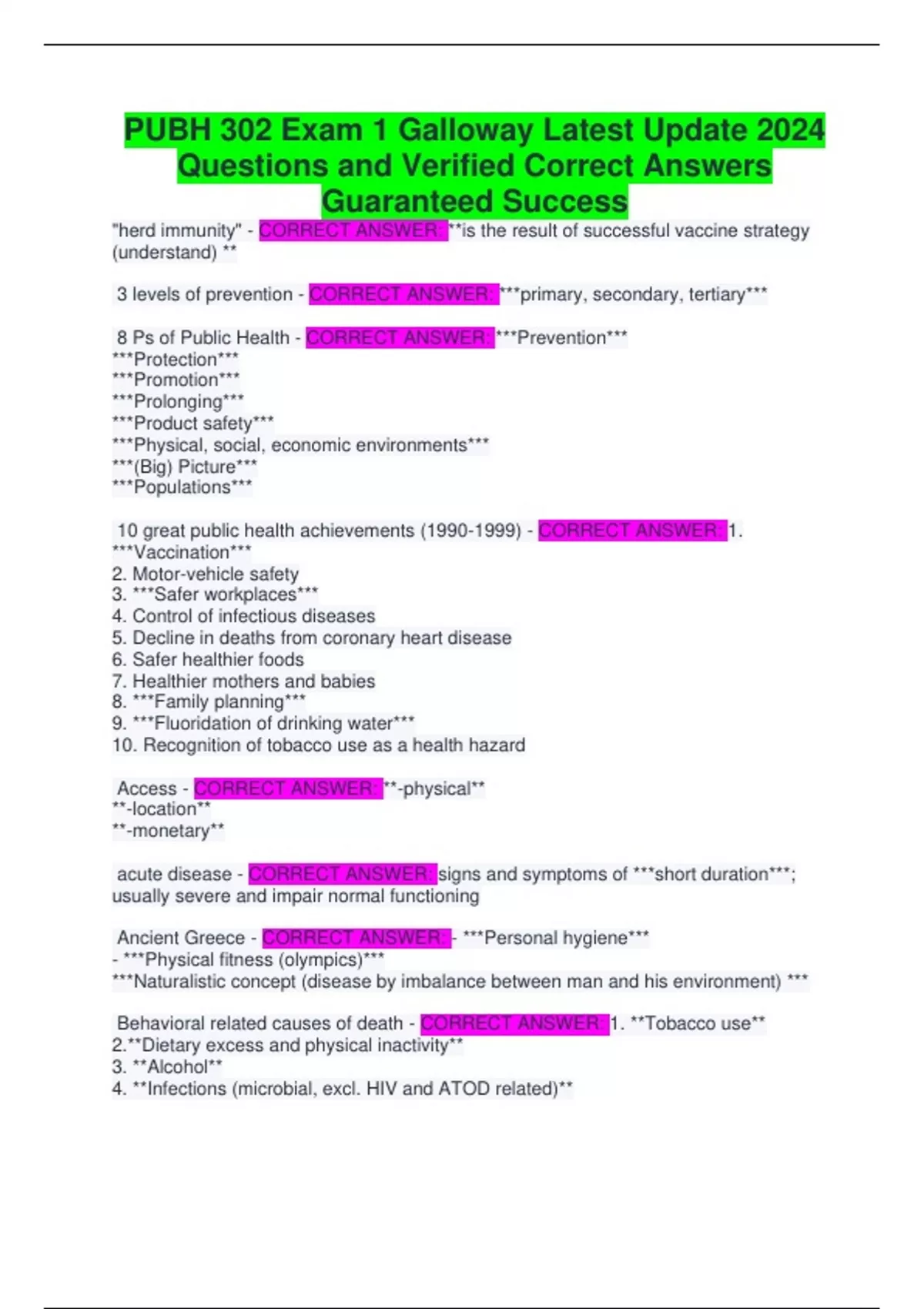 PUBH 302 Exam 1 Galloway Latest Update 2024 Questions and Verified Correct Answers Guaranteed Success