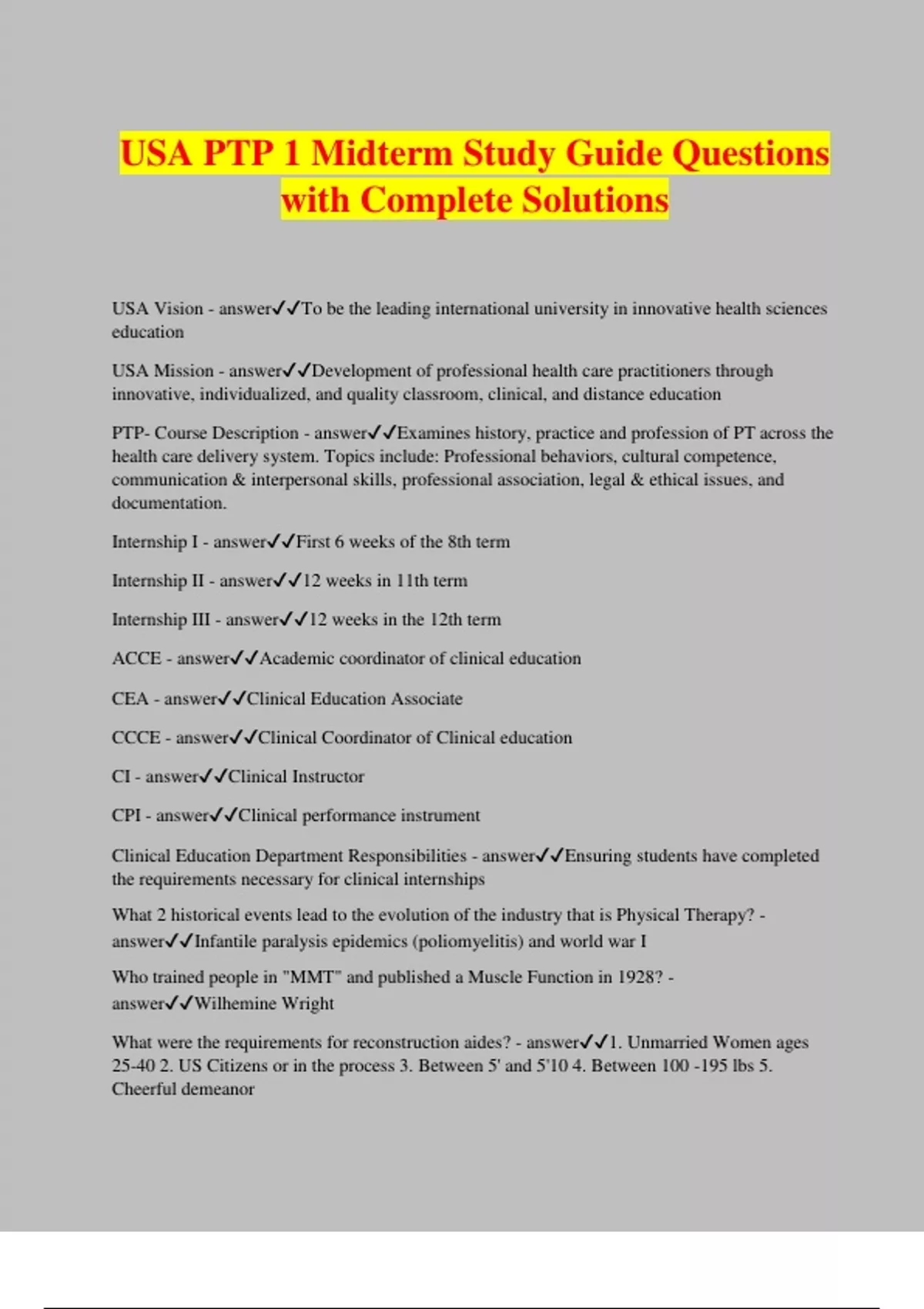 USA PTP 1 Midterm Study Guide Questions with Complete Solutions USA Vision - answerTo be the leading international university in innovative health sciences education USA Mission - answerDevelopment of professional health care practitioners through innovative, individualized, and quality classroom, clinical, and distance education PTP- Course Description - answerExamines history, practice and profession of PT across the health care delivery system. Topics include: Professional behaviors, cultural competence, communication & interpersonal skills, professional association, legal & ethical issues, and documentation. Internship I - answerFirst 6 weeks of the 8th term Internship II - answer12 weeks in 11th term Internship III - answer12 weeks in the 12th term ACCE - answerAcademic coordinator of clinical education CEA - answerClinical Education Associate CCCE - answerClinical Coordinator of Clinical education CI - answerClinical Instructor CPI - answerClinical performance instrument Clinical Education Department Responsibilities - answerEnsuring students have completed the requirements necessary for clinical internships What 2 historical events lead to the evolution of the industry that is Physical Therapy? - answerInfantile paralysis epidemics (poliomyelitis) and world war I Who trained people in "MMT" and published a Muscle Function in 1928? - answerWilhemine Wright What were the requirements for reconstruction aides? - answer1. Unmarried Women ages 25-40 2. US Citizens or in the process 3. Between 5' and 5'10 4. Between 100 -195 lbs 5. Cheerful demeanor Who was the director of reconstruction aides and established training at Walter Reed General Hospital in 1917? - answerMarguerite Sanderson Who was the first reconstruction aide to be sworn in? - answerMary McMillan Mary McMillan's achievements - answer1. Born in America, educated in England 2. Authored first textbook written by an american PT 3. One of the founders and first president of the national organization of PT 4. First Reconstruction aide in the US 5. POW who provided care to fellow captives. When did the first aides set sail for Europe? - answerJune 6th 1