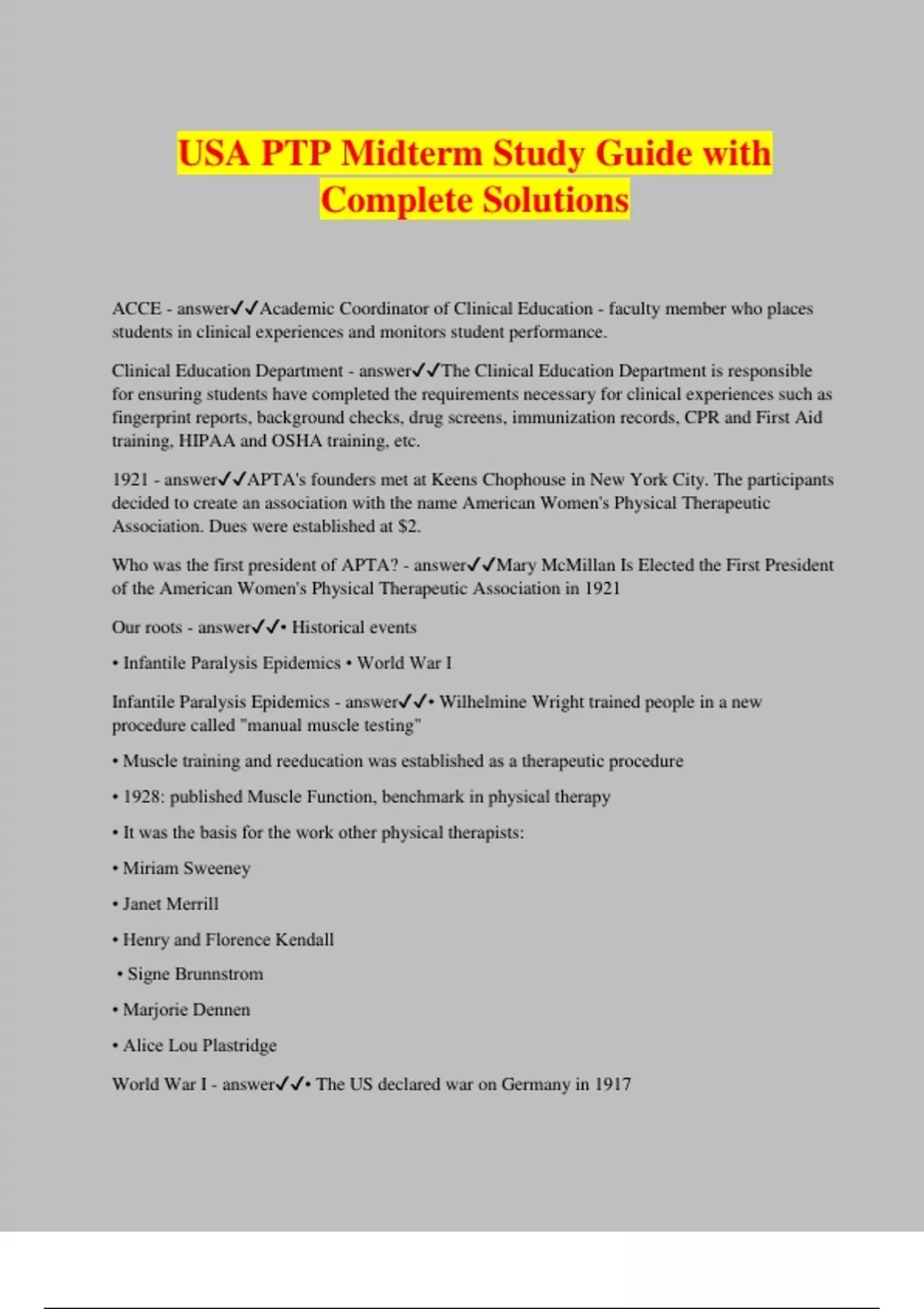 USA PTP Midterm Study Guide with Complete Solutions ACCE - answerAcademic Coordinator of Clinical Education - faculty member who places students in clinical experiences and monitors student performance. Clinical Education Department - answerThe Clinical Education Department is responsible for ensuring students have completed the requirements necessary for clinical experiences such as fingerprint reports, background checks, drug screens, immunization records, CPR and First Aid training, HIPAA and OSHA training, etc. 1921 - answerAPTA's founders met at Keens Chophouse in New York City. The participants decided to create an association with the name American Women's Physical Therapeutic Association. Dues were established at $2. Who was the first president of APTA? - answerMary McMillan Is Elected the First President of the American Women's Physical Therapeutic Association in 1921 Our roots - answer• Historical events • Infantile Paralysis Epidemics • World War I Infantile Paralysis Epidemics - answer• Wilhelmine Wright trained people in a new procedure called "manual muscle testing" • Muscle training and reeducation was established as a therapeutic procedure • 1928: published Muscle Function, benchmark in physical therapy • It was the basis for the work other physical therapists: • Miriam Sweeney • Janet Merrill • Henry and Florence Kendall • Signe Brunnstrom • Marjorie Dennen • Alice Lou Plastridge World War I - answer• The US declared war on Germany in 1917 • US Surgeon General established the Division of Special Hospitals and Physical Reconstruction on August 22, 1917 • Reconstruction Aides • Establish physical reconstruction programs to treat wounded soldiers • Mostly nurses and physical education graduates who went back to school for additional training Reconstruction Aides: - answer"They changed the lives of countless injured soldiers with no historical precedents to guide them. And they did so as independent, strong-willed women at a time when women did not have the right to vote, most did not leave home until they married, and most did not work."1 Mary McMillan - answerfirst US Reconstruction Aide • 1917: Head of the program at Walter Reed General Hospital • 1918: Established training program at Reed College in Portland, OR • Additional War Emergency Training Centers were opened Guiding Principles to Achieve the Vision of APTA - answerIdentity quality collaboration value innovation consumer-centricity access/equity advocacy APTA mission statement - answerBuilding a community that advances the profession of physical therapy to improve the health of society. VISION STATEMENT FOR THE PHYSICAL THERAPY PROFESSION - answerTransforming society by optimizing movement to improve the human experience. identity APTA - answerThe physical therapy profession will promote the movement system as the foundation for optimizing movement to improve the health of society. The movement system is the integration of body systems that generate and maintain movement at all levels of bodily function. Human movement is a complex behavior within a specific context, and is influenced by social, environmental, and personal factors. Recognition and validation of the movement system is essential to understand the structure, function, and potential of the human body. The physical therapist will be responsible for evaluating and managing an individual's movement system across the lifespan to promote optimal development; diagnose impairments, activity limitations, and participation restrictions; and provide interventions targeted at preventing or ameliorating activity limitations and participation restrictions. The movement system is the core of physical therapist practice, education, and research. quality APTA - answerThe physical therapy profession will commit to establishing and adopting best practice standards across the domains of practice, education, and research as the individuals in these domains strive to be flexible, prepared, and responsive in a dynamic and ever-changing world. As independent practitioners, doctors of physical therapy in clinical practice will embrace best practice standards in examination, diagnosis/classification, intervention, and outcome measurement. These physical therapists will generate, validate, and disseminate evidence and quality indicators, espousing payment for outcomes and patient/client satisfaction, striving to prevent adverse events related to patient care, and demonstrating continuing competence. Educators will seek to propagate the highest standards of teaching and learning, supporting collaboration and innovation throughout academia. Researchers will collaborate with clinicians to expand available evidence and translate it into practice, conduct comparative effectiveness research, standardize outcome measurement, and participate in interprofessional research teams. collaboration APTA - answerThe physical therapy profession will demonstrate the value of this with other health care providers, consumers, community organizations, and other disciplines to solve the health-related challenges that society faces. In clinical practice, doctors of physical therapy, who collaborate across the continuum of care, will ensure that services are coordinated, of value, and consumer-centered by referring, co-managing, engaging consultants, and directing and supervising care. Education models will value and foster interprofessional approaches to best meet consumer and population needs and instill team values in physical therapists and physical therapist assistants. Interprofessional research approaches will ensure that evidence translates to practice and is consumer-centered. Value APTA - answerhas been defined as "the health outcomes achieved per dollar spent".1 To ensure the best value, services that the physical therapy profession will provide will be safe, effective, patient/client-centered, timely, effic