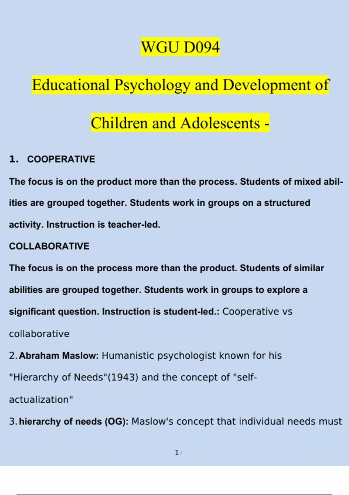 WGU D094 Educational Psychology and Development of Children and Adolescents | Questions with 100% Correct Answers | Verified | Updated 2024