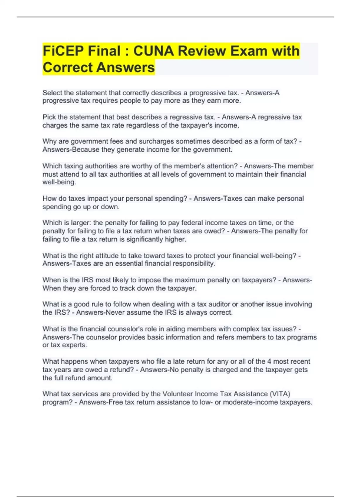 Select the statement that correctly describes a progressive tax. - Answers-A progressive tax requires people to pay more as they earn more. Pick the statement that best describes a regressive tax. - Answers-A regressive tax charges the same tax rate regardless of the taxpayer's income. Why are government fees and surcharges sometimes described as a form of tax? - Answers-Because they generate income for the government. Which taxing authorities are worthy of the member's attention? - Answers-The member must attend to all tax authorities at all levels of government to maintain their financial well-being. How do taxes impact your personal spending? - Answers-Taxes can make personal spending go up or down. Which is larger: the penalty for failing to pay federal income taxes on time, or the penalty for failing to file a tax return when taxes are owed? - Answers-The penalty for failing to file a tax return is significantly higher. What is the right attitude to take toward taxes to protect your financial well-being? - Answers-Taxes are an essential financial responsibility. When is the IRS most likely to impose the maximum penalty on taxpayers? - Answers-When they are forced to track down the taxpayer. What is a good rule to follow when dealing with a tax auditor or another issue involving the IRS? - Answers-Never assume the IRS is always correct. What is the financial counselor's role in aiding members with complex tax issues? - Answers-The counselor provides basic information and refers members to tax programs or tax experts. What happens when taxpayers who file a late return for any or all of the 4 most recent tax years are owed a refund? - Answers-No penalty is charged and the taxpayer gets the full refund amount. What tax services are provided by the Volunteer Income Tax Assistance (VITA) program? - Answers-Free tax return assistance to low- or moderate-income taxpayers.