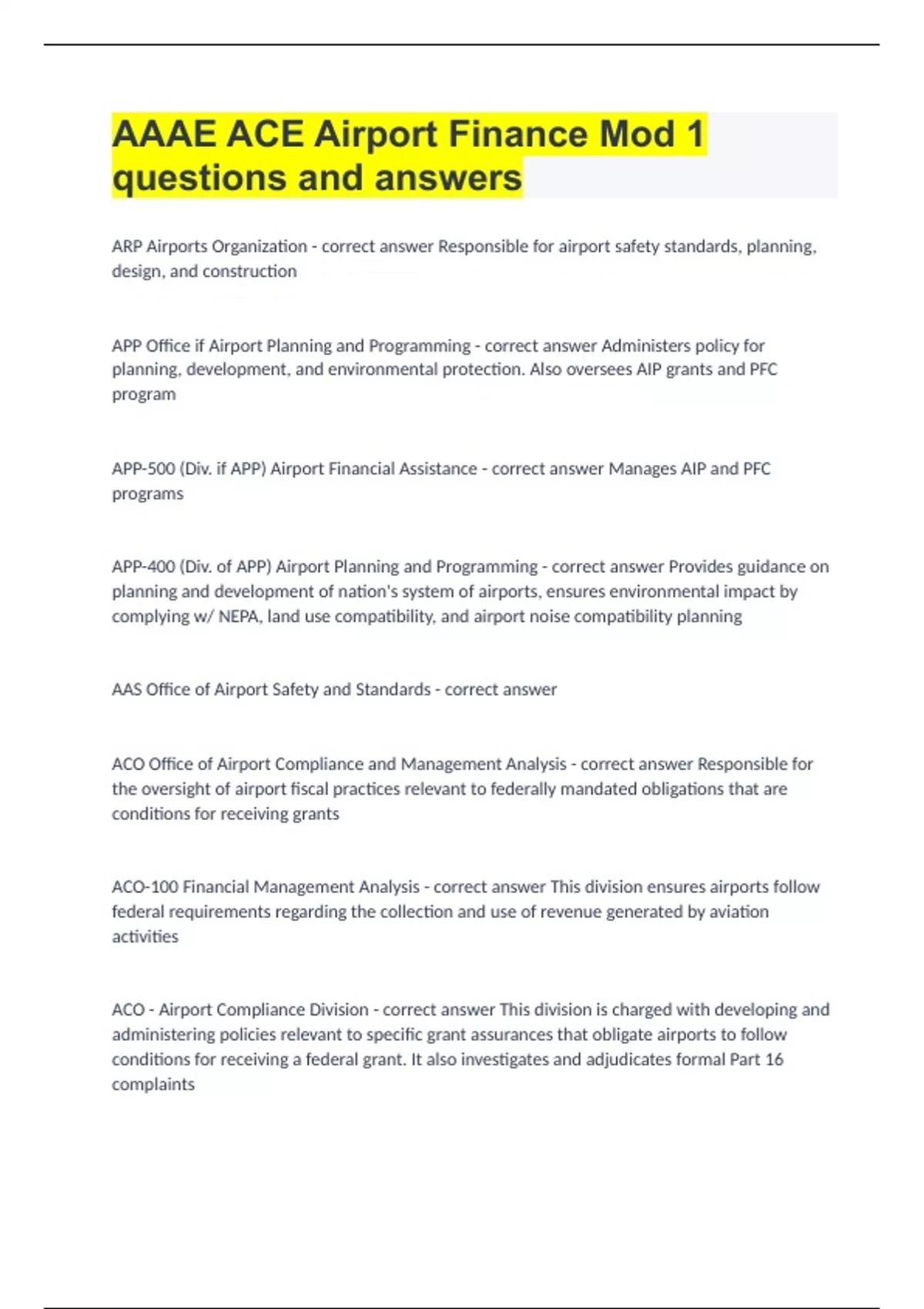 AAAE ACE Airport Finance Mod 1 questions and answers ARP Airports Organization - correct answer Responsible for airport safety standards, planning, design, and construction APP Office if Airport Planning and Programming - correct answer Administers policy for planning, development, and environmental protection. Also oversees AIP grants and PFC program APP-500 (Div. if APP) Airport Financial Assistance - correct answer Manages AIP and PFC programs