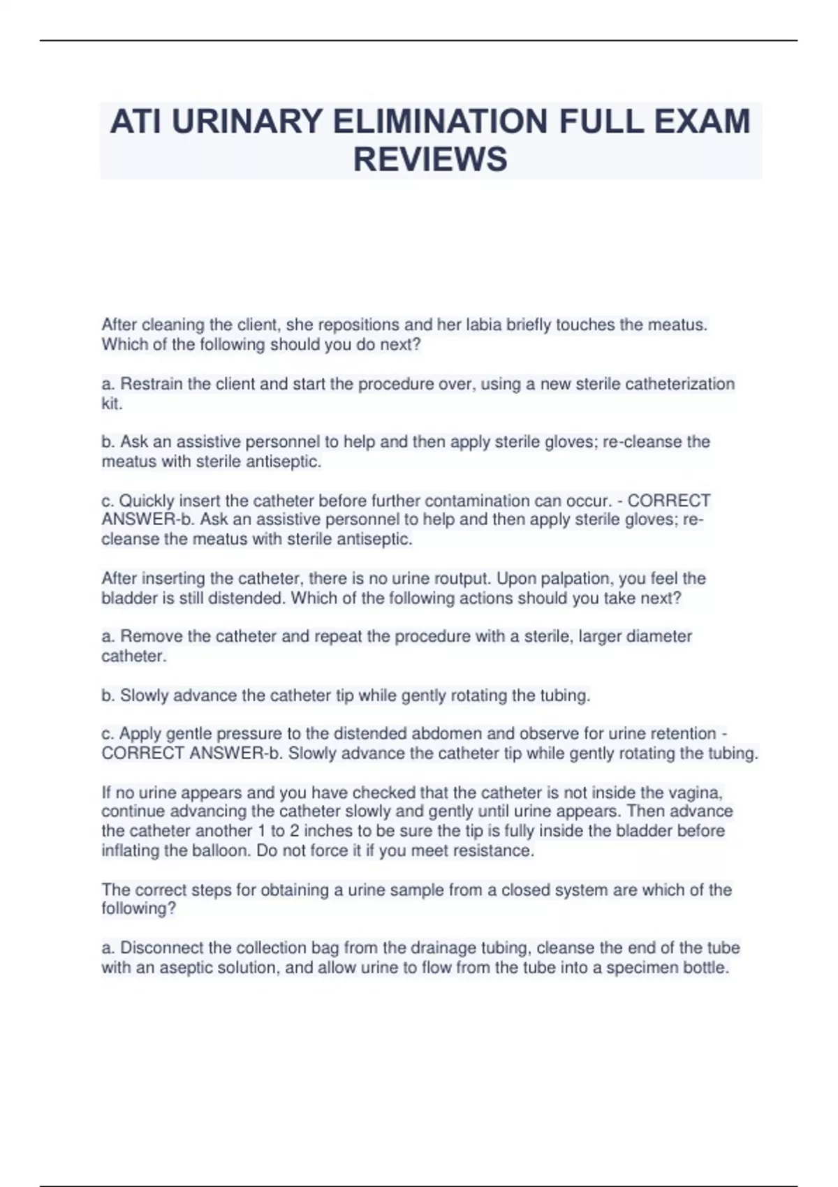 ATI URINARY ELIMINATION FULL EXAM REVIEWS