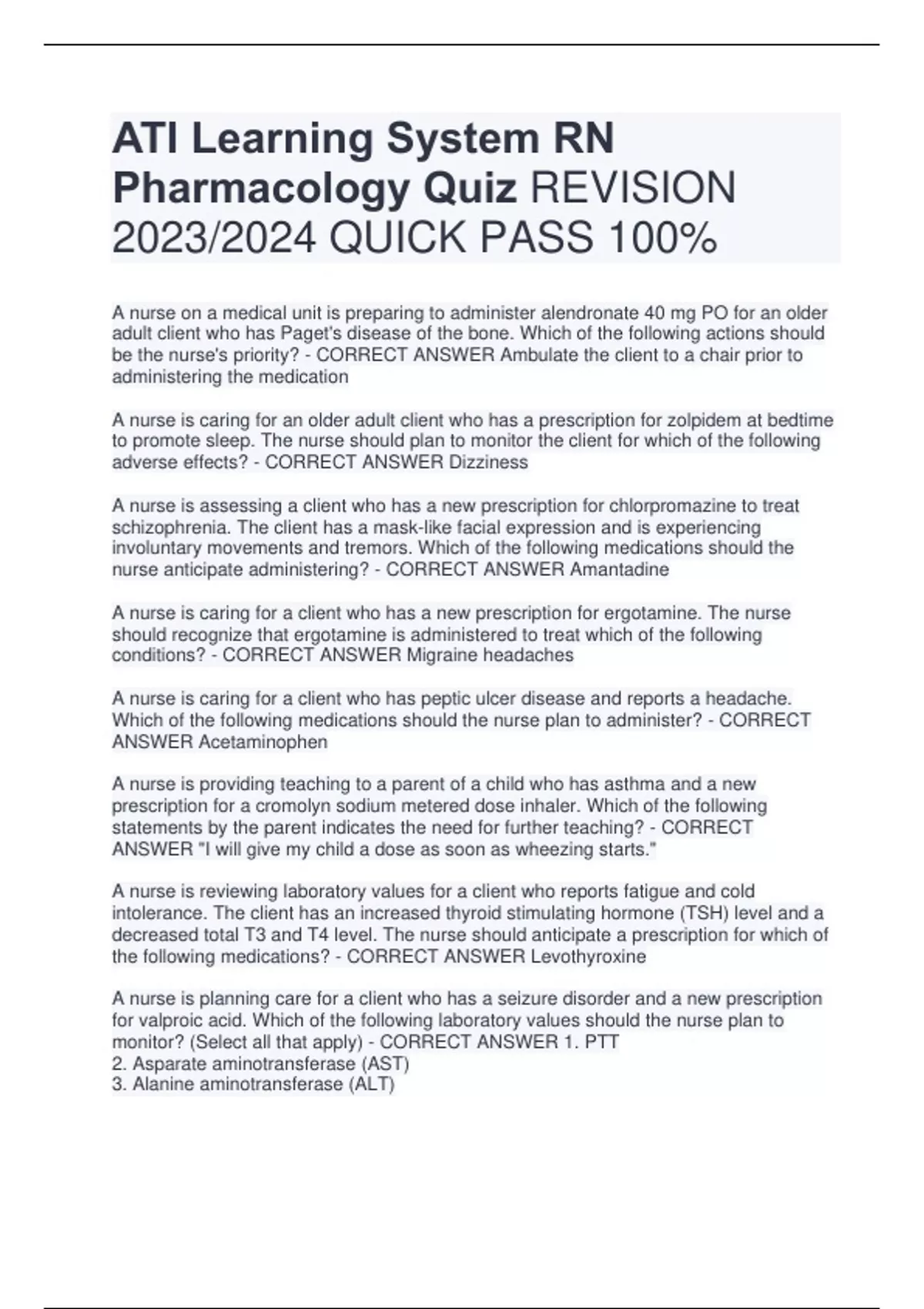 ATI Learning System RN Pharmacology Quiz REVISION 2023/2024 QUICK PASS 100%