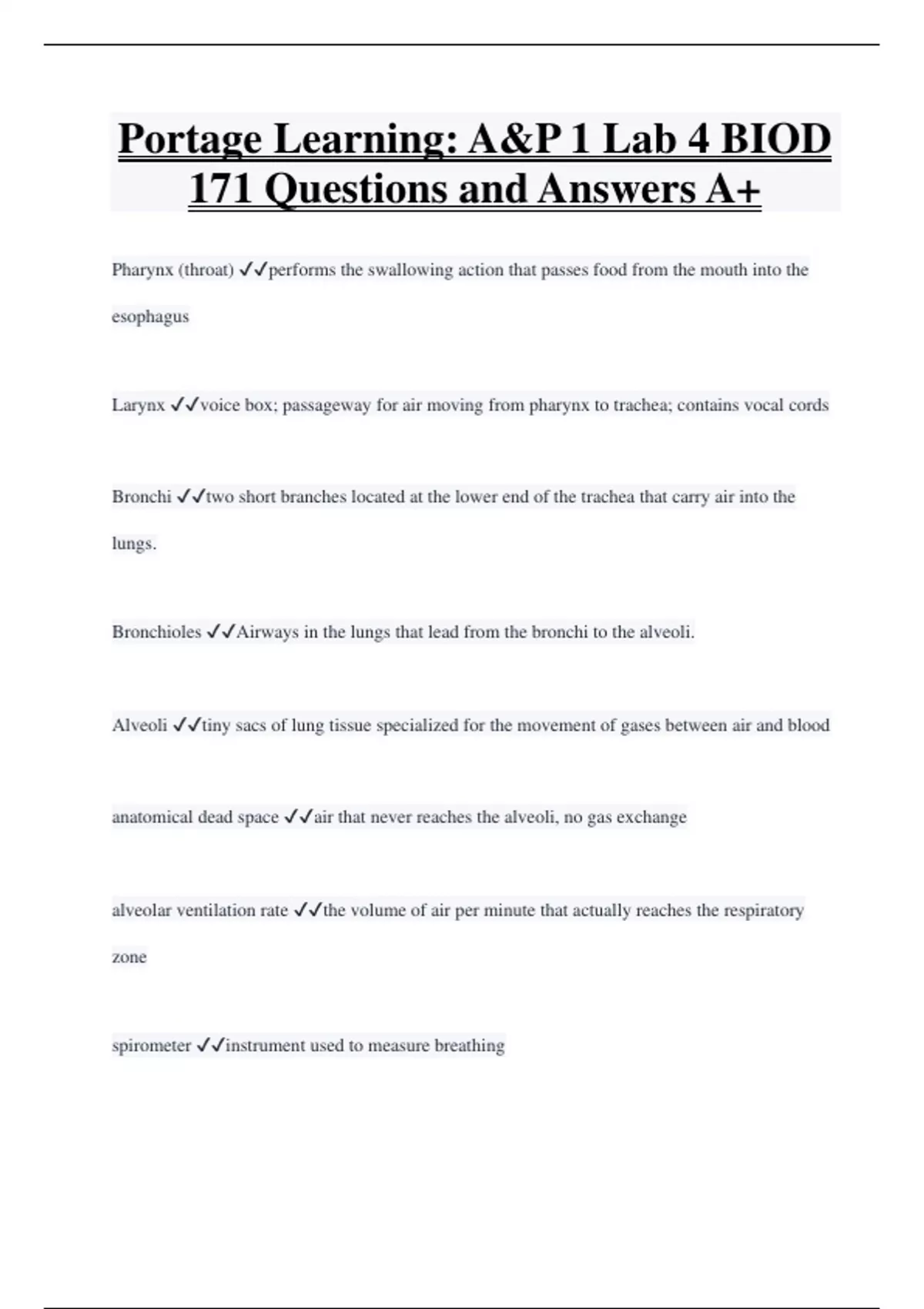 Portage Learning: A&P 1 Lab 4 BIOD 171 Questions and Answers A+ Pharynx (throat) performs the swallowing action that passes food from the mouth into the esophagus Larynx voice box; passageway for air moving from pharynx to trachea; contains vocal cords Bronchi two short branches located at the lower end of the trachea that carry air into the lungs. Bronchioles Airways in the lungs that lead from the bronchi to the alveoli. Alveoli tiny sacs of lung tissue specialized for the movement of gases between air and blood anatomical dead space air that never reaches the alveoli, no gas exchange