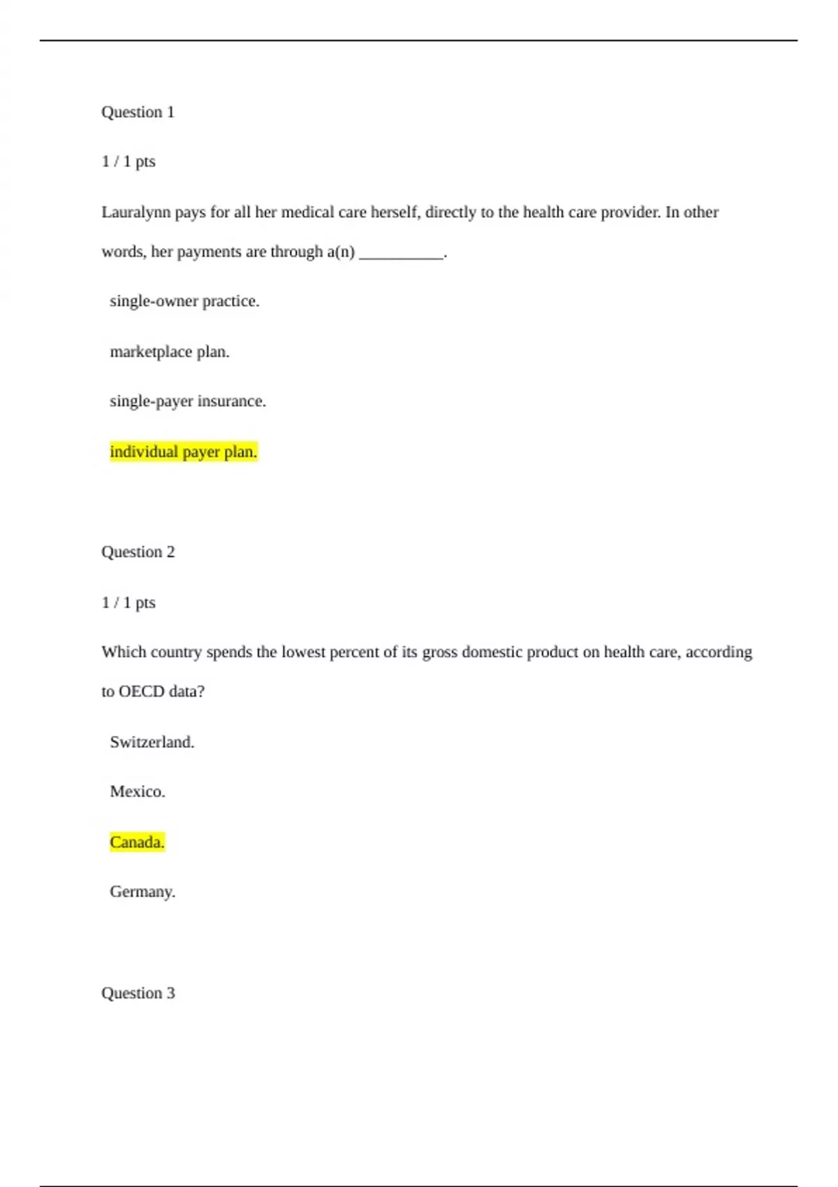 Question 1 1 / 1 pts Lauralynn pays for all her medical care herself, directly to the health care provider. In other words, her payments are through a(n) __________. single-owner practice. marketplace plan. single-payer insurance. individual payer plan. Question 2 1 / 1 pts Which country spends the lowest percent of its gross domestic product on health care, according to OECD data? Switzerland. Mexico. Canada. Germany.