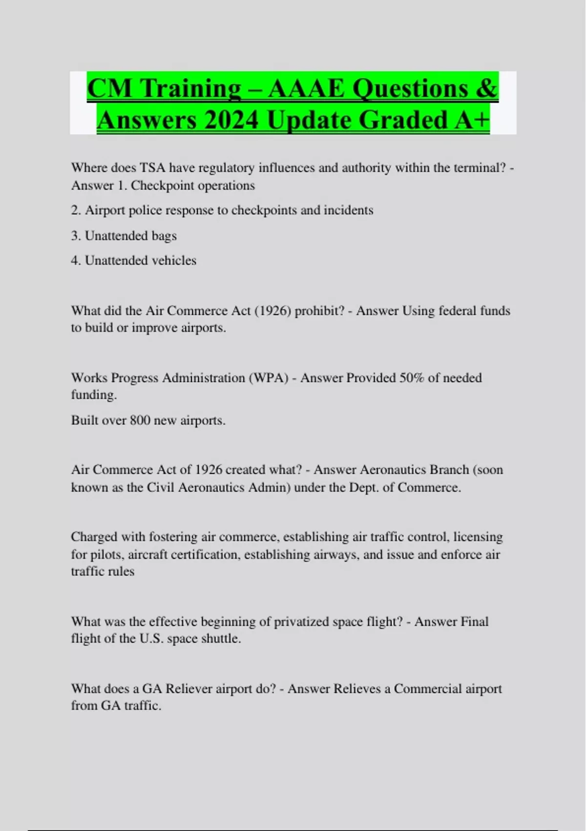CM Training – AAAE Questions & Answers 2024 Update Graded A+ Where does TSA have regulatory influences and authority within the terminal? - Answer 1. Checkpoint operations 2. Airport police response to checkpoints and incidents 3. Unattended bags 4. Unattended vehicles What did the Air Commerce Act (1926) prohibit? - Answer Using federal funds to build or improve airports. Works Progress Administration (WPA) - Answer Provided 50% of needed funding. Built over 800 new airports. Air Commerce Act of 1926 created what? - Answer Aeronautics Branch (soon known as the Civil Aeronautics Admin) under the Dept. of Commerce. Charged with fostering air commerce, establishing air traffic control, licensing for pilots, aircraft certification, establishing airways, and issue and enforce air traffic rules What was the effective beginning of privatized space flight? - Answer Final flight of the U.S. space shuttle. What does a GA Reliever airport do? - Answer Relieves a Commercial airport from GA traffic