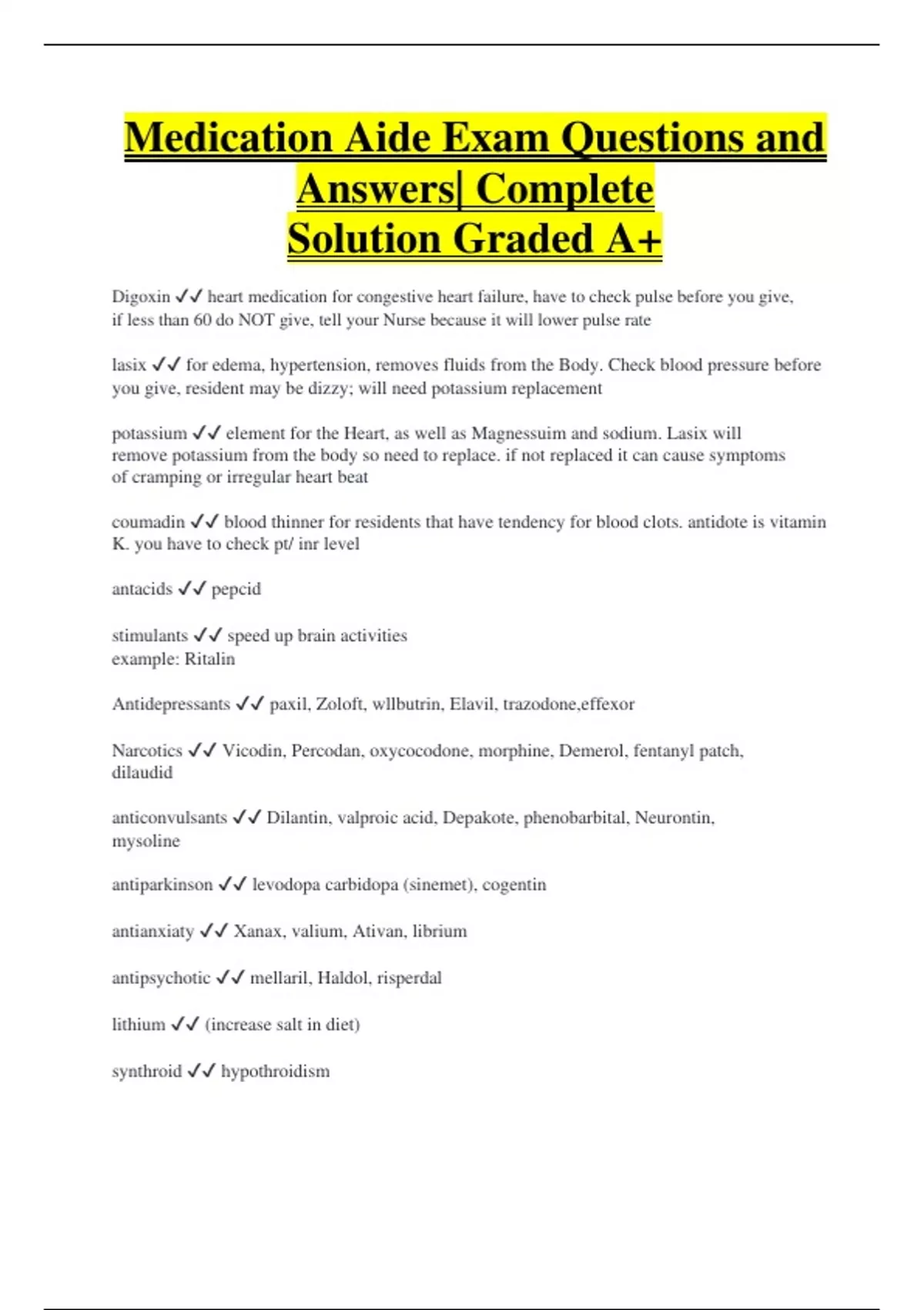 Medication Aide Exam Questions and Answers| Complete Solution Graded A+ Digoxin heart medication for congestive heart failure, have to check pulse before you give, if less than 60 do NOT give, tell your Nurse because it will lower pulse rate lasix for edema, hypertension, removes fluids from the Body. Check blood pressure before you give, resident may be dizzy; will need potassium replacement potassium element for the Heart, as well as Magnessuim and sodium. Lasix will remove potassium from the body so need to replace. if not replaced it can cause symptoms of cramping or irregular heart beat coumadin blood thinner for residents that have tendency for blood clots. antidote is vitamin K. you have to check pt/ inr level antacids pepcid stimulants speed up brain activities example: Ritalin Antidepressants paxil, Zoloft, wllbutrin, Elavil, trazodone,effexor Narcotics Vicodin, Percodan, oxycocodone, morphine, Demerol, fentanyl patch, dilaudid anticonvulsants Dilantin, valproic acid, Depakote, phenobarbital, Neurontin, mysoline antiparkinson levodopa carbidopa (sinemet), cogentin antianxiaty Xanax, valium, Ativan, librium antipsychotic mellaril, Haldol, risperdal lithium (increase salt in diet) synthroid hypothroidism