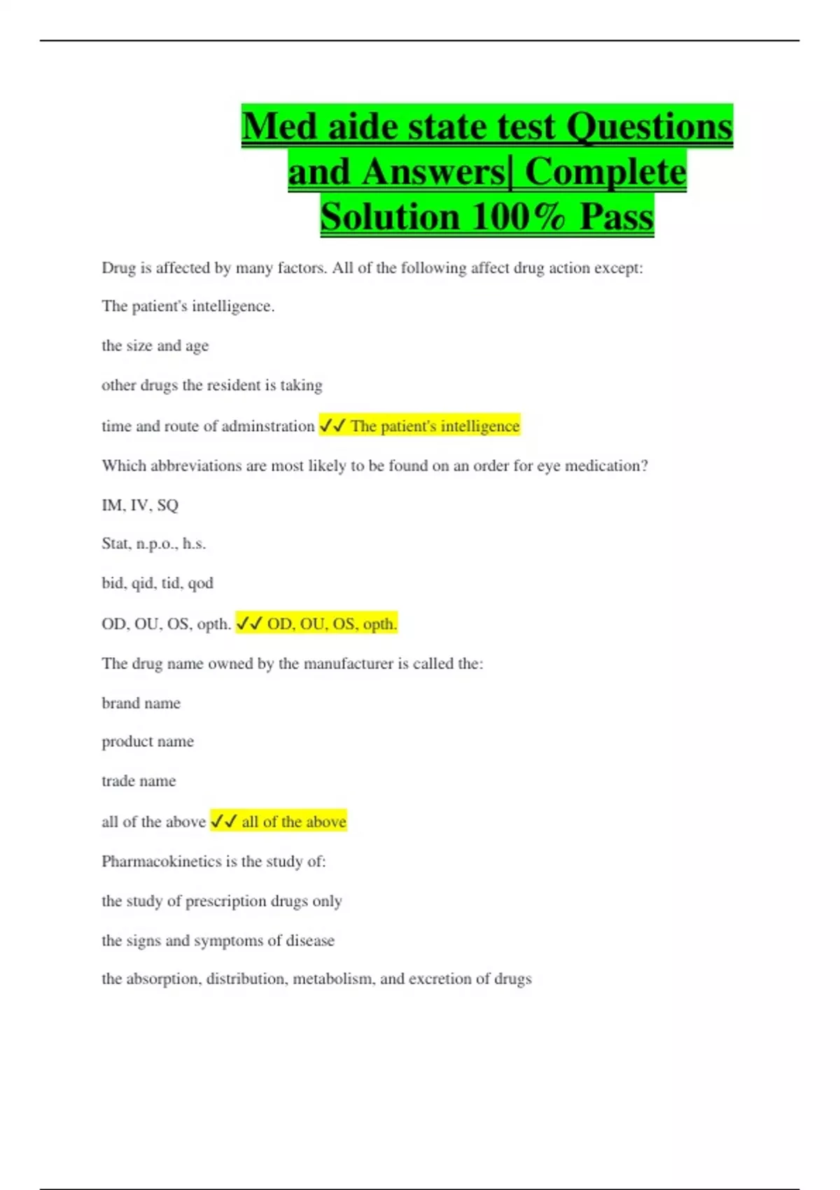 Med aide state test Questions and Answers| Complete Solution 100% Pass Drug is affected by many factors. All of the following affect drug action except: The patient's intelligence. the size and age other drugs the resident is taking time and route of adminstration The patient's intelligence Which abbreviations are most likely to be found on an order for eye medication? IM, IV, SQ Stat, n.p.o., h.s. bid, qid, tid, qod OD, OU, OS, opth. OD, OU, OS, opth. The drug name owned by the manufacturer is called the: brand name product name trade name all of the above all of the above Pharmacokinetics is the study of: the study of prescription drugs only the signs and symptoms of disease the absorption, distribution, metabolism, and excretion of drugs