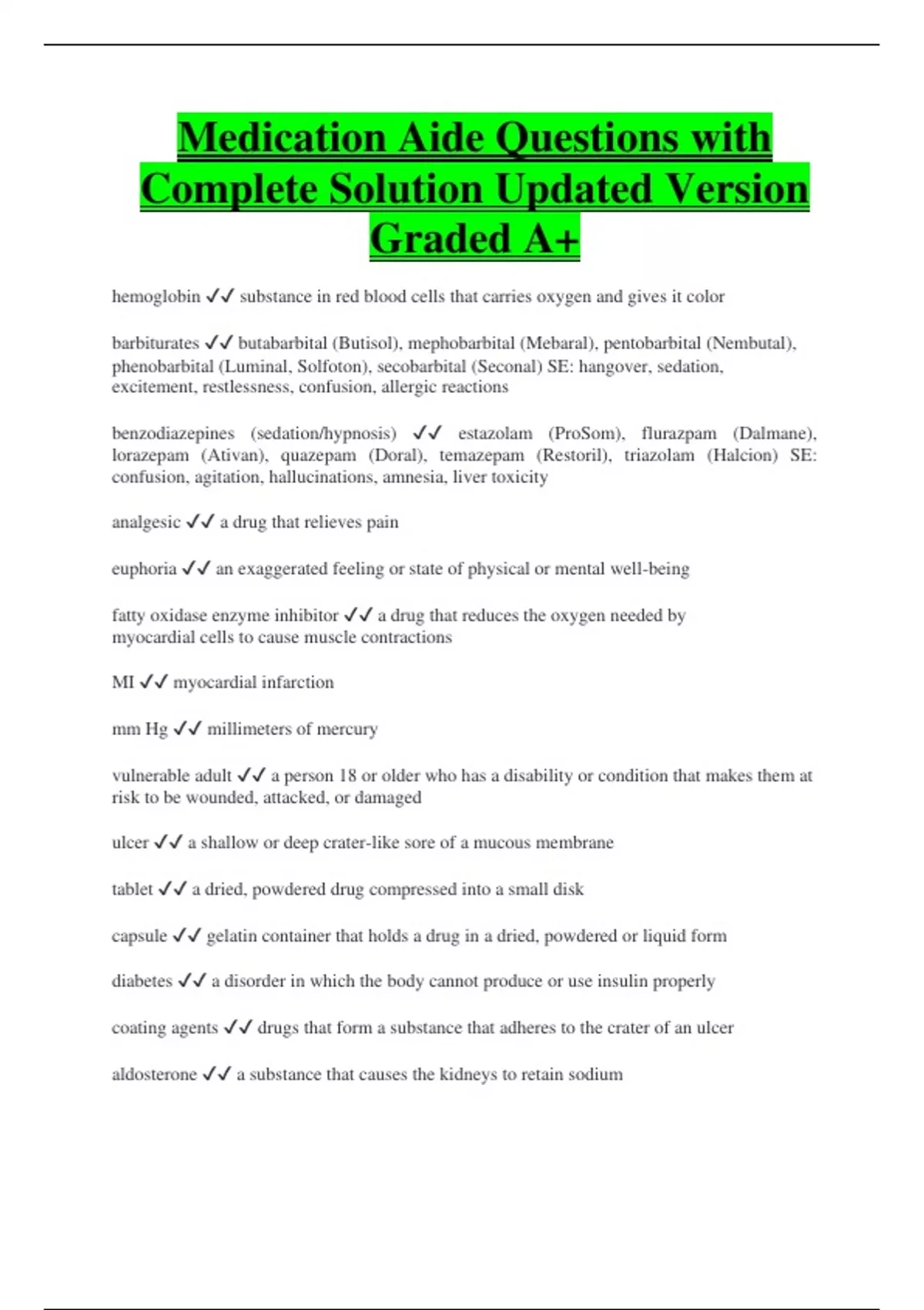 Medication Aide Questions with Complete Solution Updated Version Graded A+ hemoglobin substance in red blood cells that carries oxygen and gives it color barbiturates butabarbital (Butisol), mephobarbital (Mebaral), pentobarbital (Nembutal), phenobarbital (Luminal, Solfoton), secobarbital (Seconal) SE: hangover, sedation, excitement, restlessness, confusion, allergic reactions benzodiazepines (sedation/hypnosis) estazolam (ProSom), flurazpam (Dalmane), lorazepam (Ativan), quazepam (Doral), temazepam (Restoril), triazolam (Halcion) SE: confusion, agitation, hallucinations, amnesia, liver toxicity analgesic a drug that relieves pain euphoria an exaggerated feeling or state of physical or mental well-being fatty oxidase enzyme inhibitor a drug that reduces the oxygen needed by myocardial cells to cause muscle contractions MI myocardial infarction mm Hg millimeters of mercury vulnerable adult a person 18 or older who has a disability or condition that makes them at risk to be wounded, attacked, or damaged