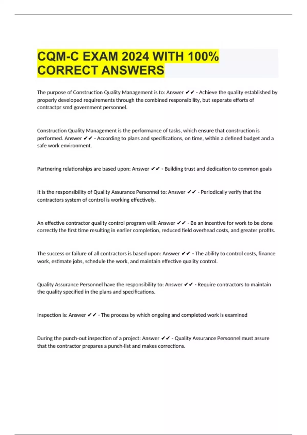 The purpose of Construction Quality Management is to: Answer - Achieve the quality established by properly developed requirements through the combined responsibility, but seperate efforts of contractpr smd government personnel. Construction Quality Management is the performance of tasks, which ensure that construction is performed. Answer - According to plans and specifications, on time, within a defined budget and a safe work environment. Partnering relationships are based upon: Answer - Building trust and dedication to common goals It is the responsibility of Quality Assurance Personnel to: Answer - Periodically verify that the contractors system of control is working effectively. An effective contractor quality control program will: Answer - Be an incentive for work to be done correctly the first time resulting in earlier completion, reduced field overhead costs, and greater profits. The success or failure of all contractors is based upon: Answer - The ability to control costs, finance work, estimate jobs, schedule the work, and maintain effective quality control. Quality Assurance Personnel have the responsibility to: Answer - Require contractors to maintain the quality specified in the plans and specifications. Inspection is: Answer - The process by which ongoing and completed work is examined During the punch-out inspection of a project: Answer - Quality Assurance Personnel must assure that the contractor prepares a punch-list and makes corrections. If there is a disagreement whether the contractors work complies with the contract: Answer - The government makes the final determination Characteristics that describe a definable feature of work include: Answer - Cross-referenced listings to the contractors construction schedule that may have more than one definable feature under a section of the specifications. The _____________________ consists of daily checks of the work to assure continuing compliance with contract requirements. Answer - Follow-up phase The Quality Assurance Plan: Answer - Is a government management tool establishing staffing, training, pre-award activities, and surveillance activities.